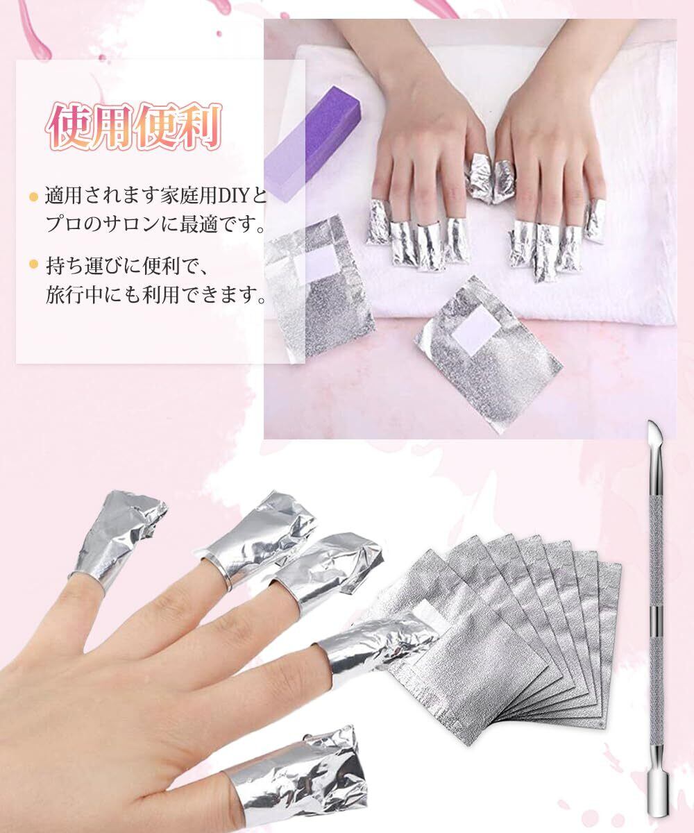 【使いやすさ】ネイルポリッシュリムーバーをコットンパッドに注ぎ、アルミホイルでしっかりと指に巻き付け、10〜15分待ってから慎重にアルミホイルを取り外し、スチールプッシャーで除去します。
