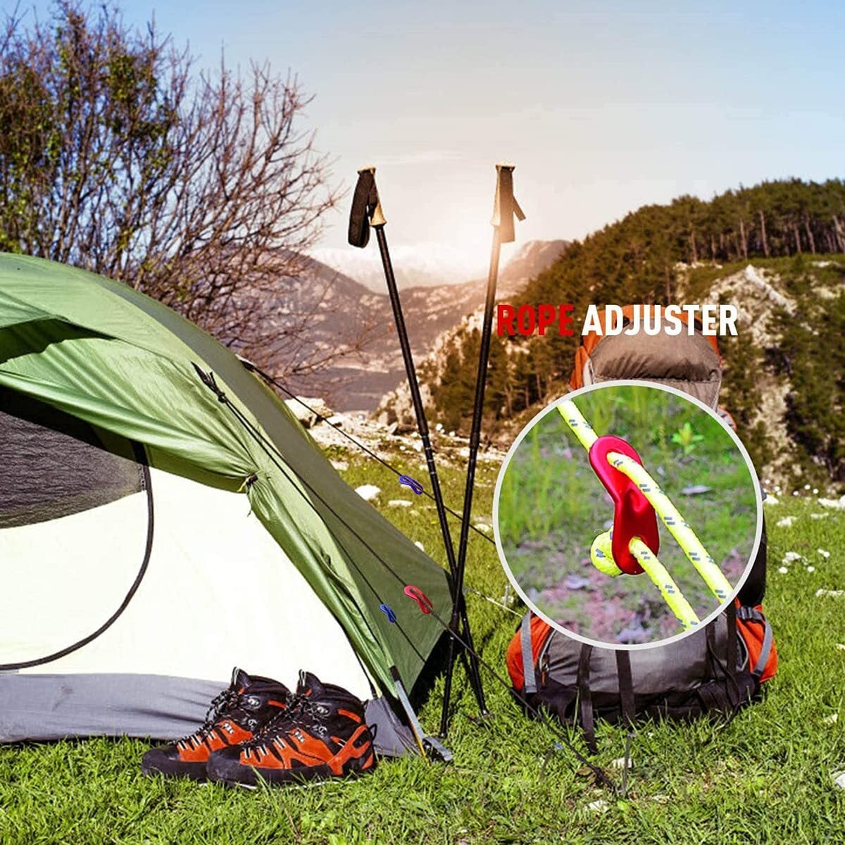 5、様々なシーンで活躍:ロープ長さ調整の機能を備えるこのアルミ自在金具はテント自在金具としてキャンプテントの応用以外に、天幕、タープ、パラシュートコードの張り調整も適用します。