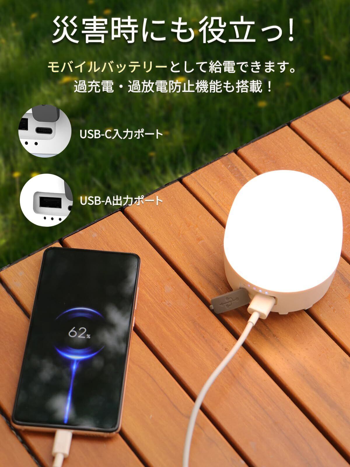 【IPX5防水・360°明るく照らす】IPX5の防水機能搭載なので汗をかいたり急な雨が降っても使えます。キャンプのみならず釣りやサイクリングでも使用可能。ランプはどこに置いても全体を照らせる、使いやすい360度タイプです。ボタンは携行中の意図しない点灯を防止するボタン設計ですので、電源ボタンを2秒間長押して点灯します。ランタン ledはUSBタイプC充電式です。※充電中に電量表示インジケーターが点灯しない場合、バッテリーが過度放電保護モードに入った可能性があります。この場合、1時間ほど充電し続けてバッテリー電圧を3.7V以上に上げると、充電状態が表示されるようになります。PD規格の充電ケ一プル(タイプC to タイプCケーブル)は対応不可。明るさは260ルーメンです。