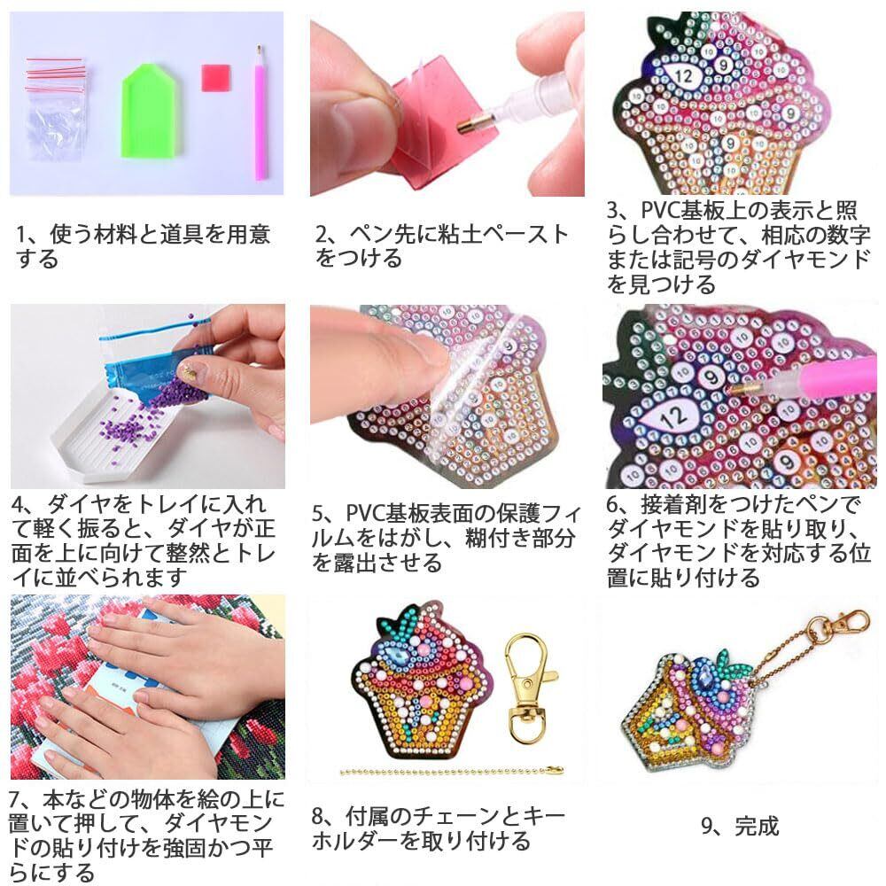 セット内容:ダイヤモンドキーホルダーセット4セット、PVC基板*4+チェーン*4+キーホルダー*4+ダイヤモンド材料パック*1+ツールパック*1(ダイヤモンド粘筆*1+プラスチックパレット*1+粘土糊*1+若干分装袋)サイズ:約6.5 cm×7.5cm。