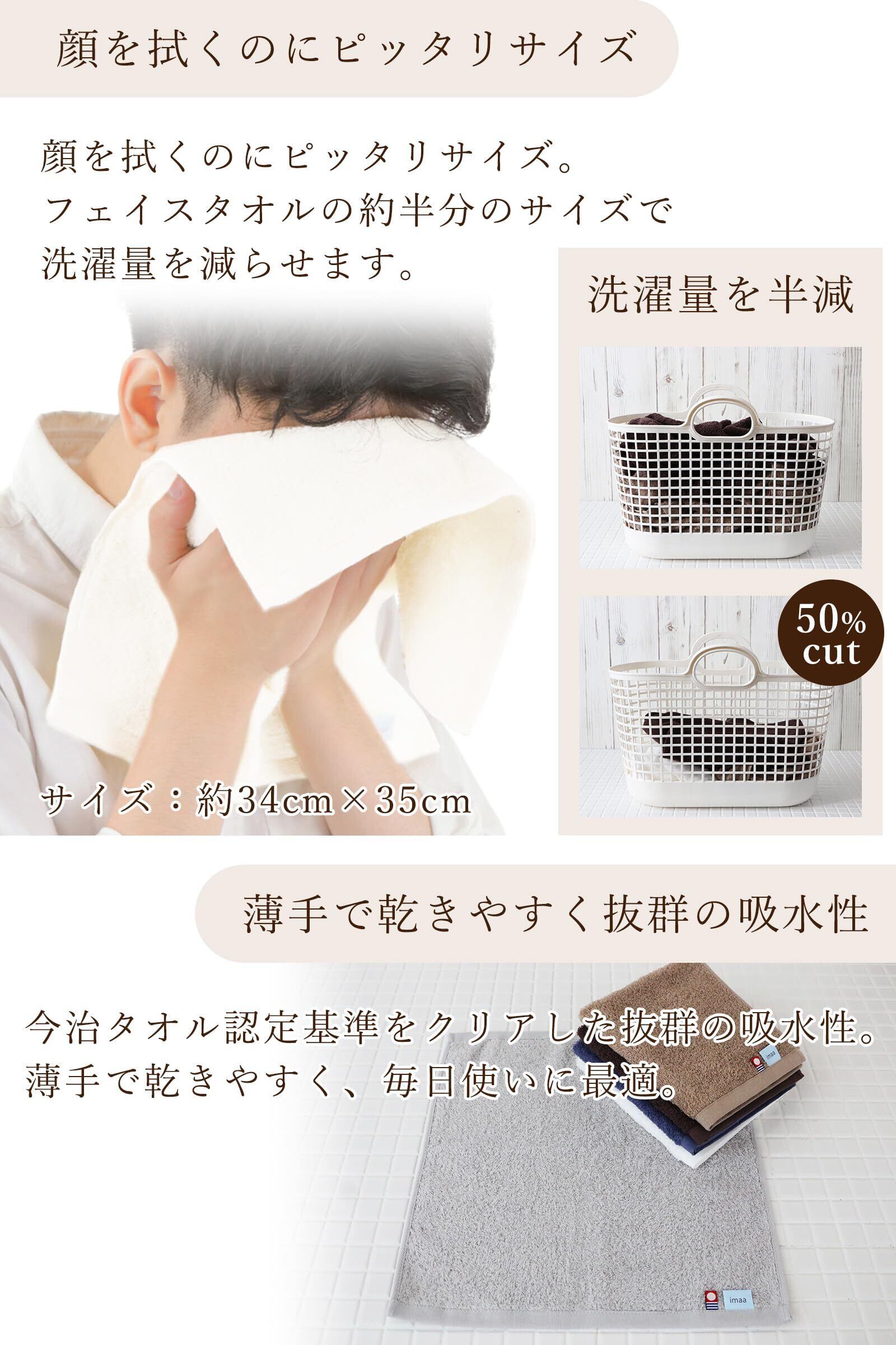 顔を拭くのにピッタリサイズで、フェイスタオルの約半分のサイズで洗濯量を減らせます。