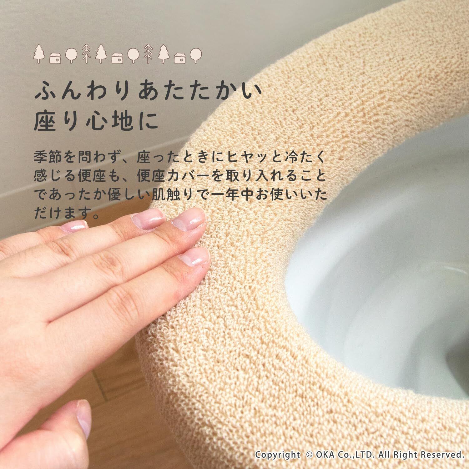 ほっとする穏やかな風景を描いた北欧テイストのトイレシリーズ「ナタルシーナリー」でお揃いにできるO型専用の便座カバー。トイレの空間でほっと一息、リラックスできるような落ち着く印象のカラーに仕上がっています。洗濯ネットに入れて丸洗い可能で衛生的にいつでもお使いいただけます。暗めのベージュとネイビーが空間に馴染みやすく、温かみが感じられます。