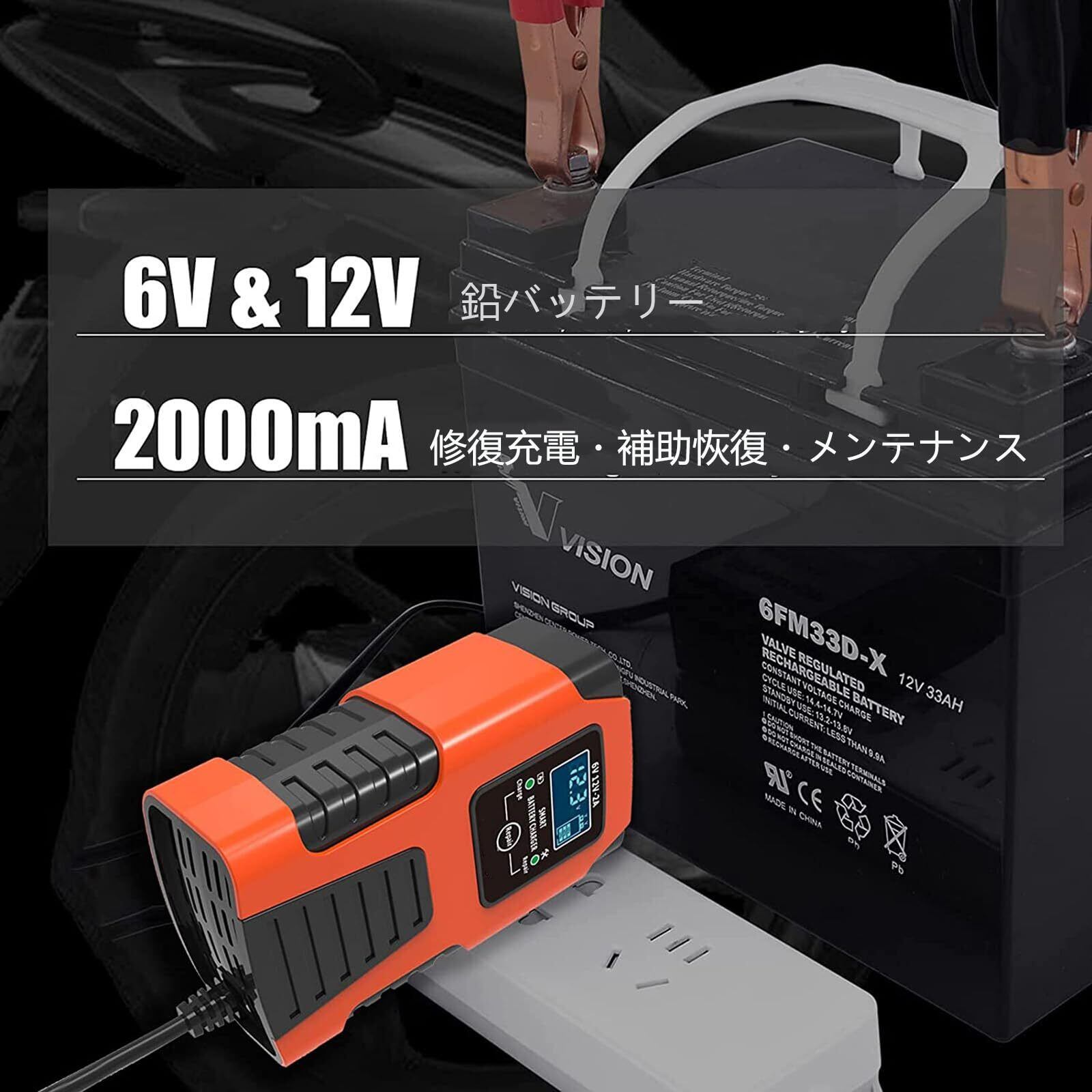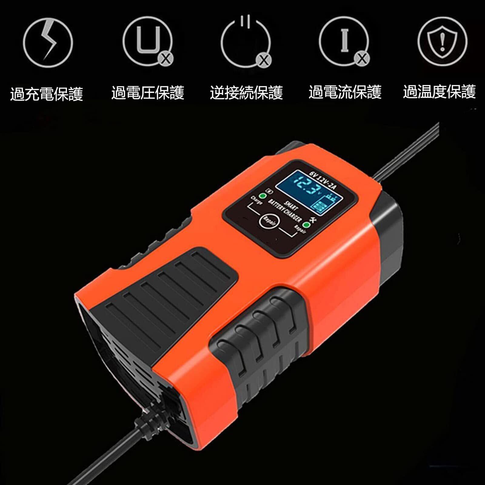 6Vと12V用バッテリー充電器 全自動バッテリーチャージャー 修復機能 パルス充電 メンテナンス充電 2A充電 4-40Ah用 自動車&バイク用