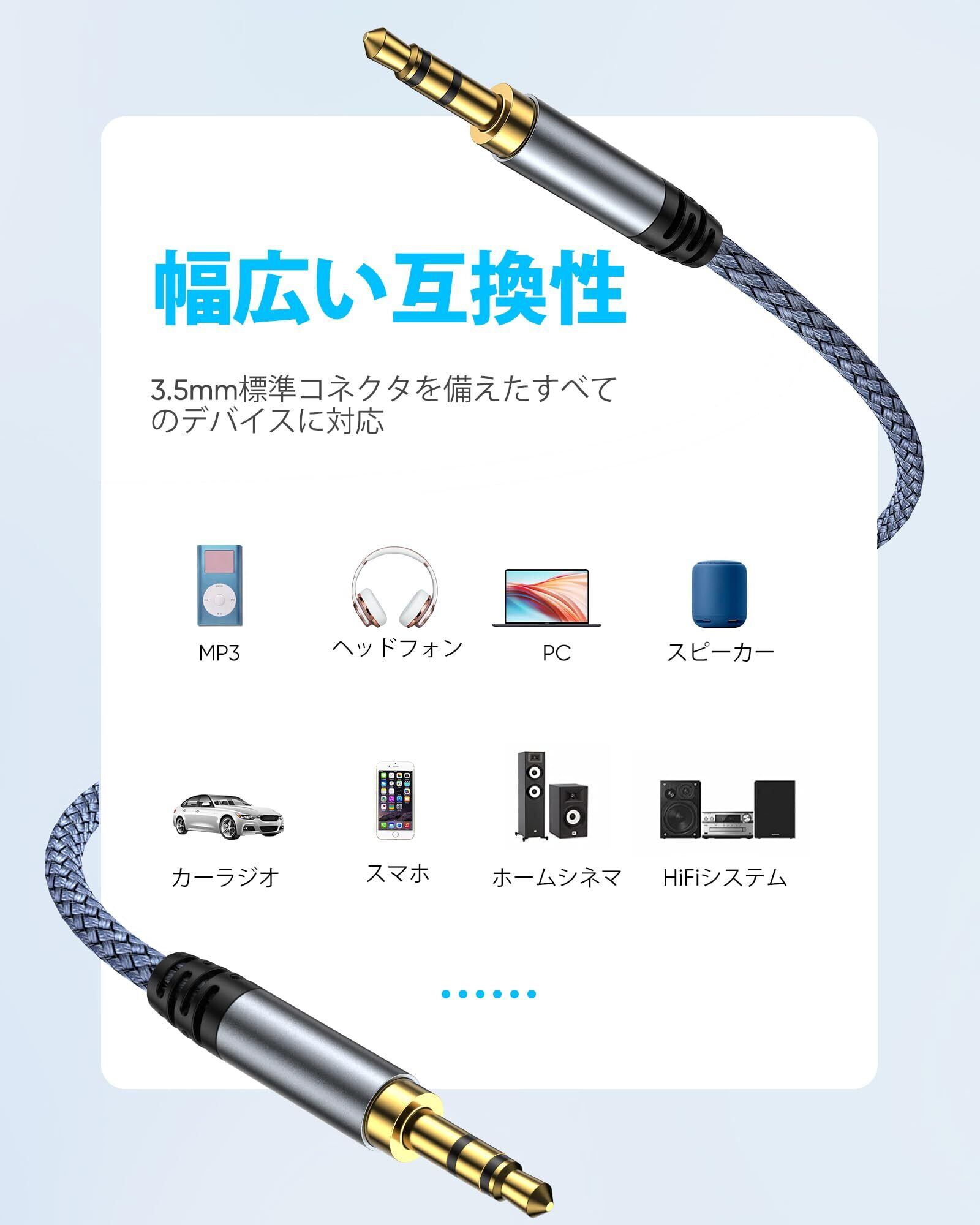 高強度ナイロン編み:Highwings AUXオーディオケーブルには、高強度で破損しにくいナイロンケーブルで編組されています。25,000回以上の曲げテストと引っ張りテストを経て、長寿命をします。内部錫メッキ銅線と多層シールド保護により信頼性を確保し、信号損失を低減し、クリアなオリジナルサウンドを提供します。