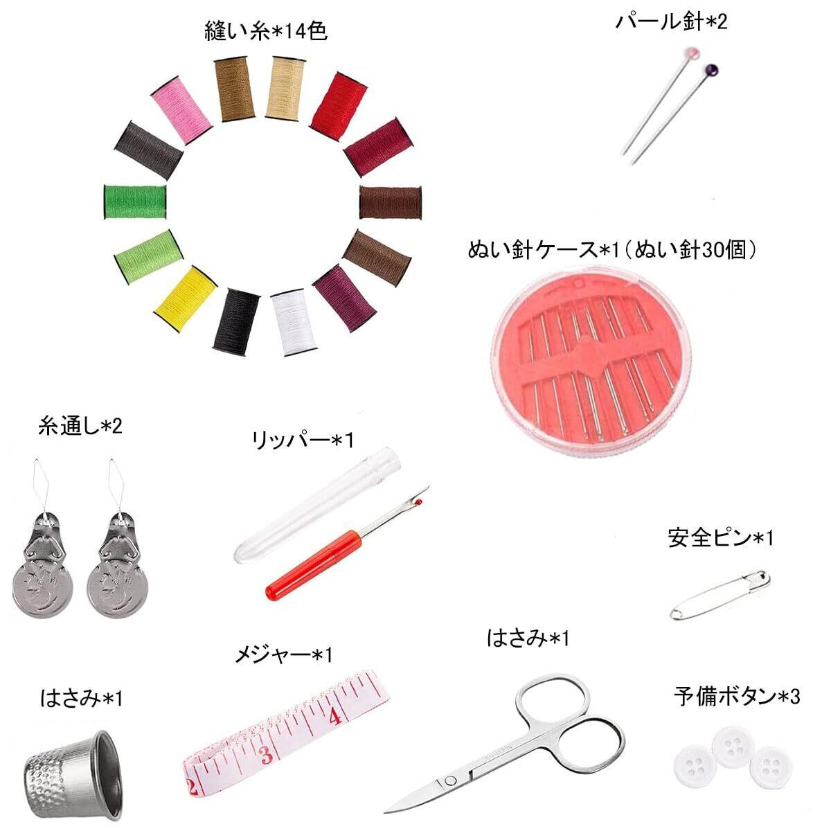 セット内容:収納バック*1、縫い糸*14色、ぬい針ケース*1(ぬい針30個)、糸通し*2、安全ピン*1、はさみ*1、リッパー*1、指ぬき*1、メジャー*1、パール針*2、予備ボタン*3