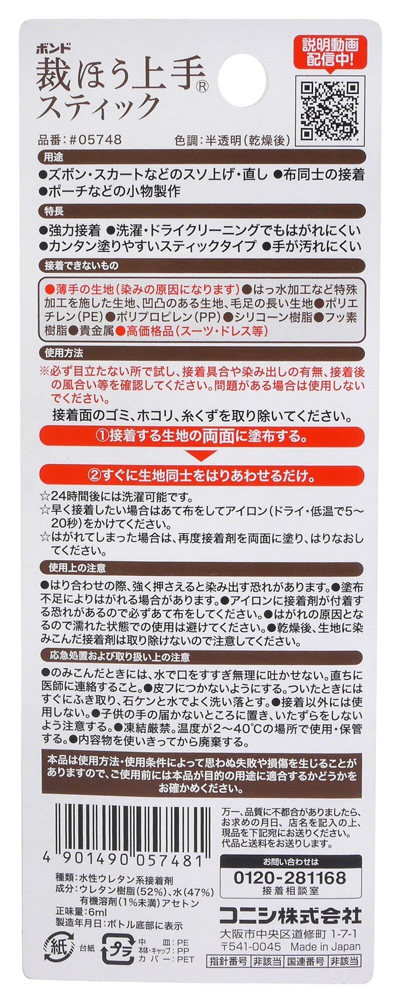 注意事項:必ず貼り合わせる両方の布に塗ってください。接着できないもの(薄手の生地(シミの原因になります),撥水加工など特殊加工した生地,熱に弱い生地,凹凸のある生地,毛足の長い生地,ポリエチレン,ポリプロピレン,シリコーン樹脂,フッ素樹脂,貴金属,高価格品(スーツ,ドレス等)),凍結厳禁。温度が2~40度の場所で使用・保管する。