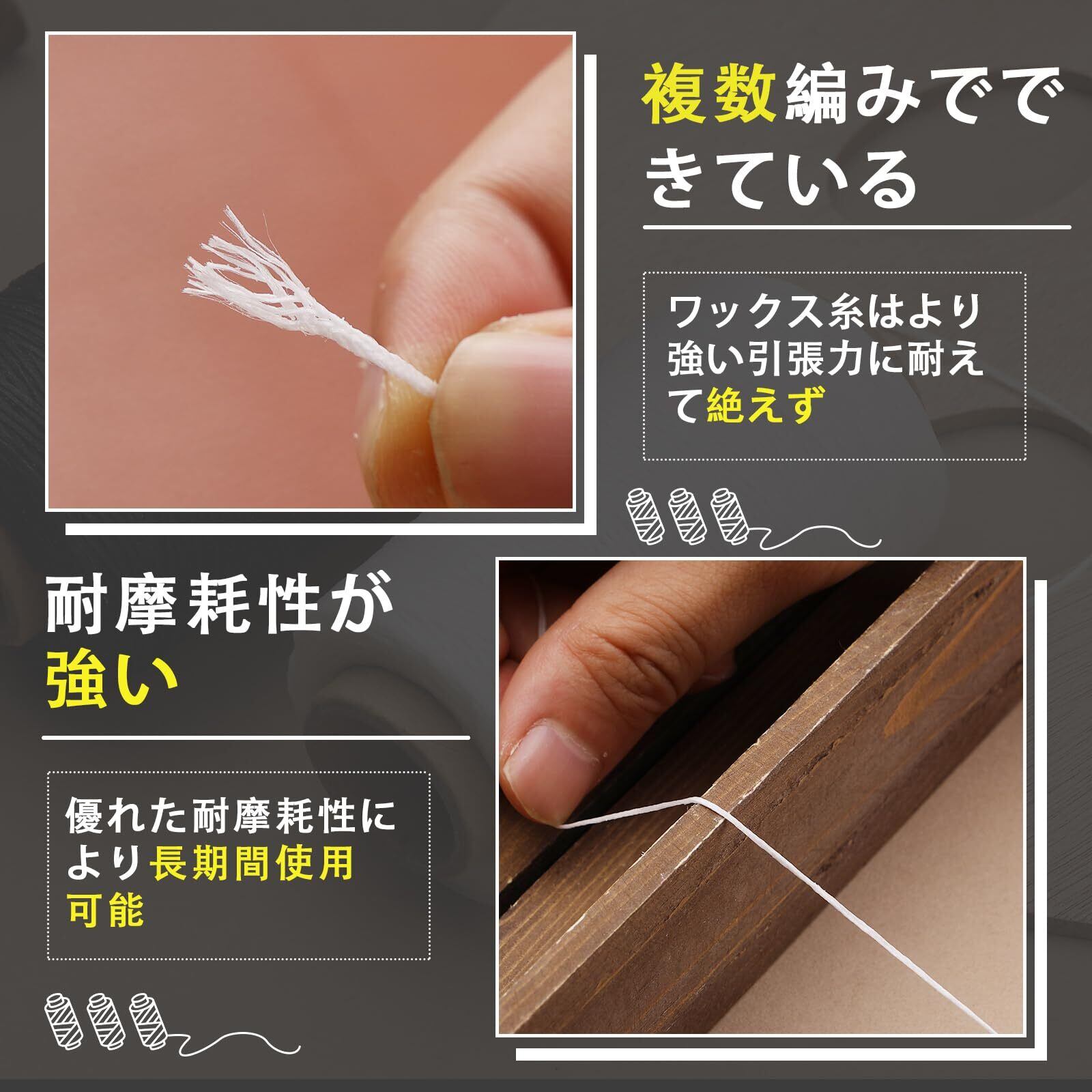 強度は抜群:レザークラフトに最適の蝋引き糸!ロウ引き済だからすぐに縫い始められ、細かいステッチにも耐える強度があります。ロウ引きされた紐はとても丈夫で、水にも強いです。丈夫で切れにくく、スムーズな縫い心地