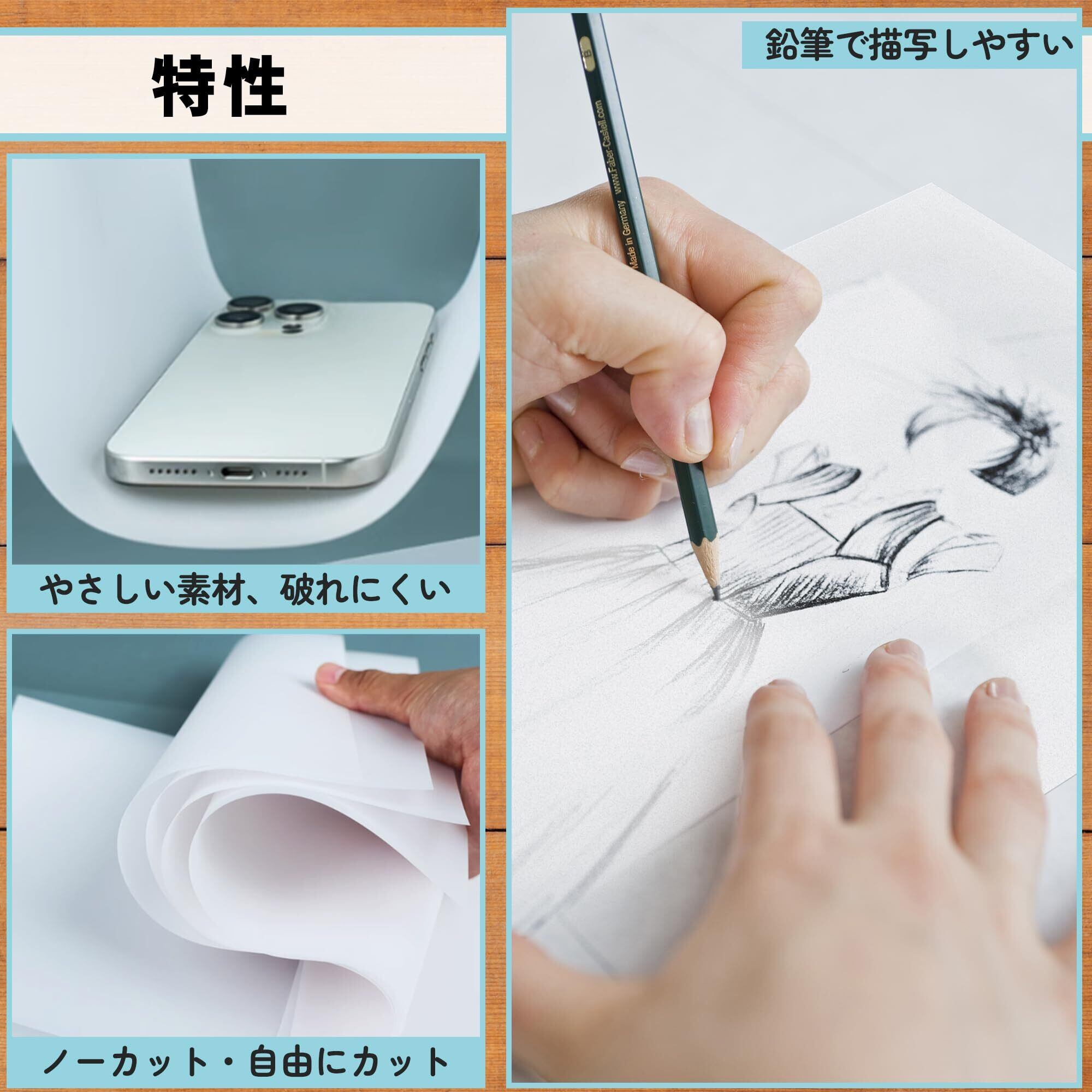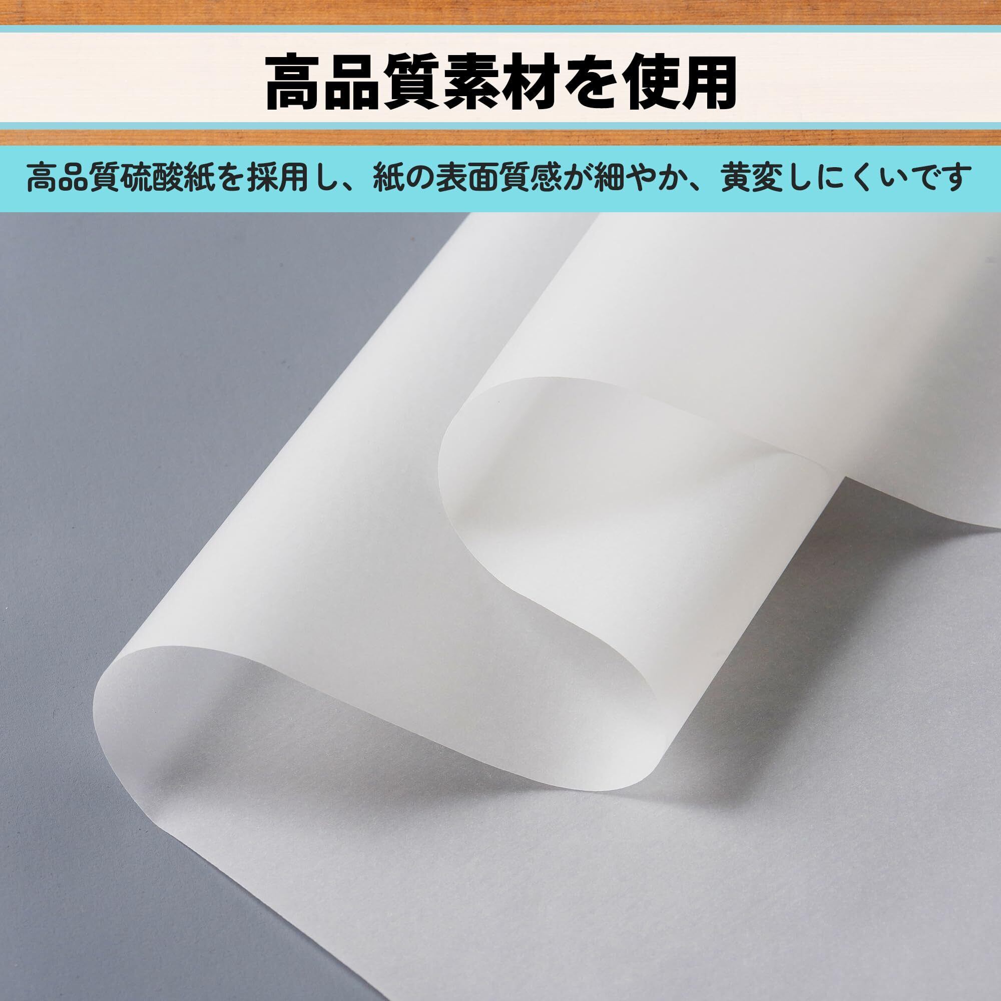 「高品質素材を採用」高品質硫酸紙を採用し、紙の表面質感が細やか、黄変しにくいトレーシングペーパーです、鉛筆で書いたものに消しゴムで消せます