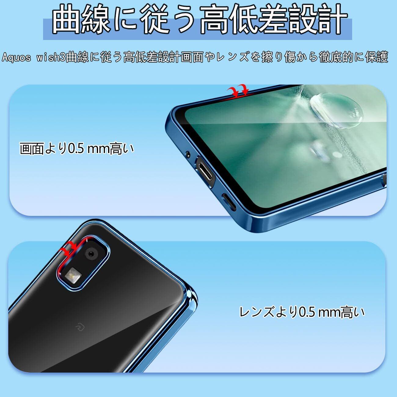 AQUOS wish3 ケース クリア ウィッシュ3 カバー 透明 スマホケース 耐衝撃 柔軟 TPU 保護カバー SH-53D A302SH SH-M25 A303SH カバー 衝撃吸収 メッキ加工 ソフトケース 人気 カバー ストラップホール付き ワイヤレス充電対応 アクオス ウィッシュ3 ケース(ブルー)