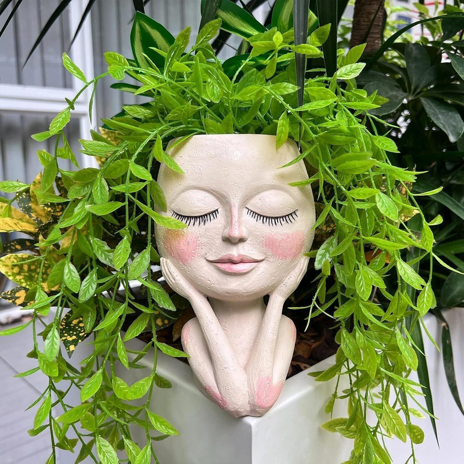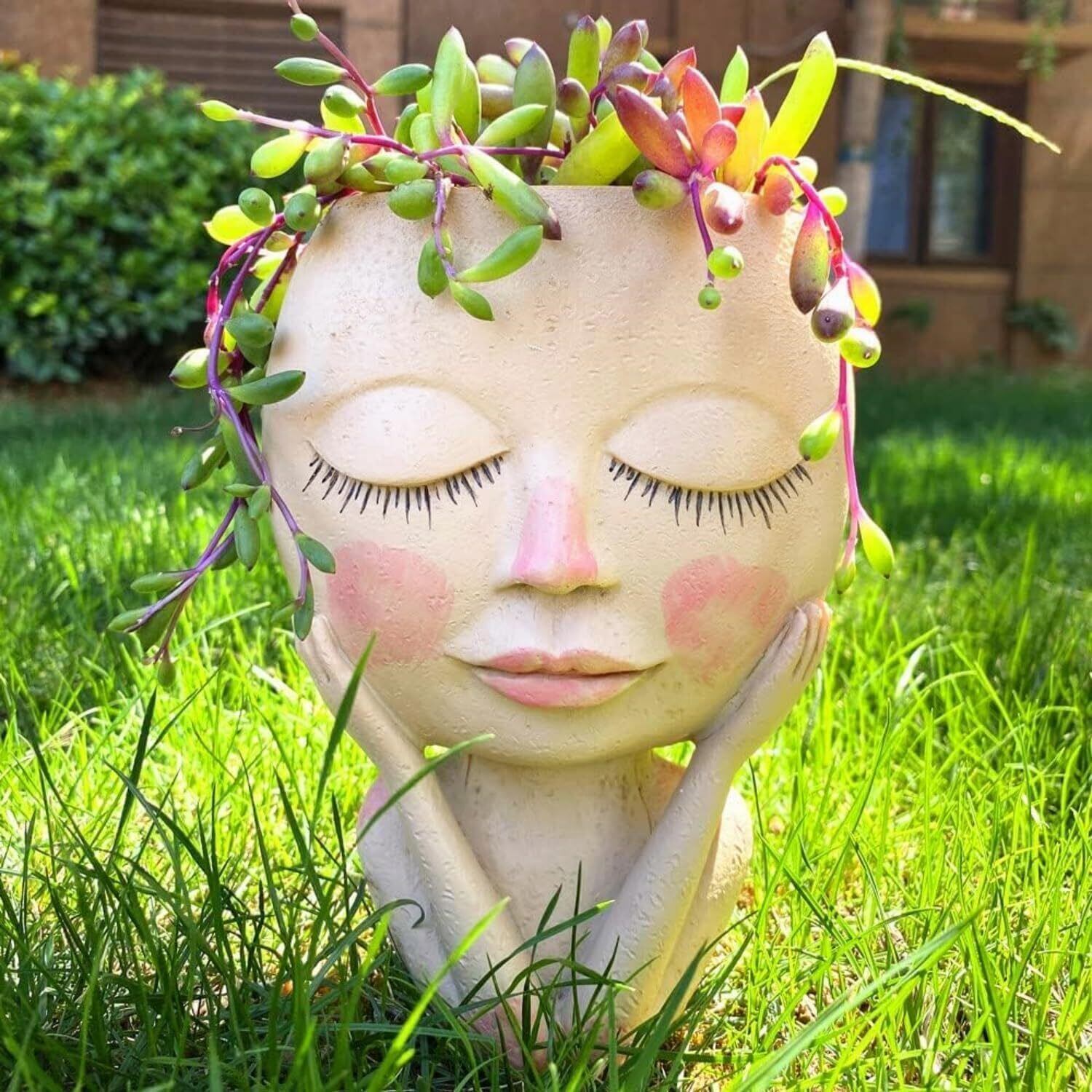 ヘッドプランター 植木鉢 顔 フェイスプランターポット 可愛い女子の顔プランター 萌えフラワーポット フェイスプランターポット 花瓶 観葉植物の鉢 フェイス花器 樹脂 サボテンプランタ 屋内外植物用 水抜き穴付き (顎に両手を当てる)