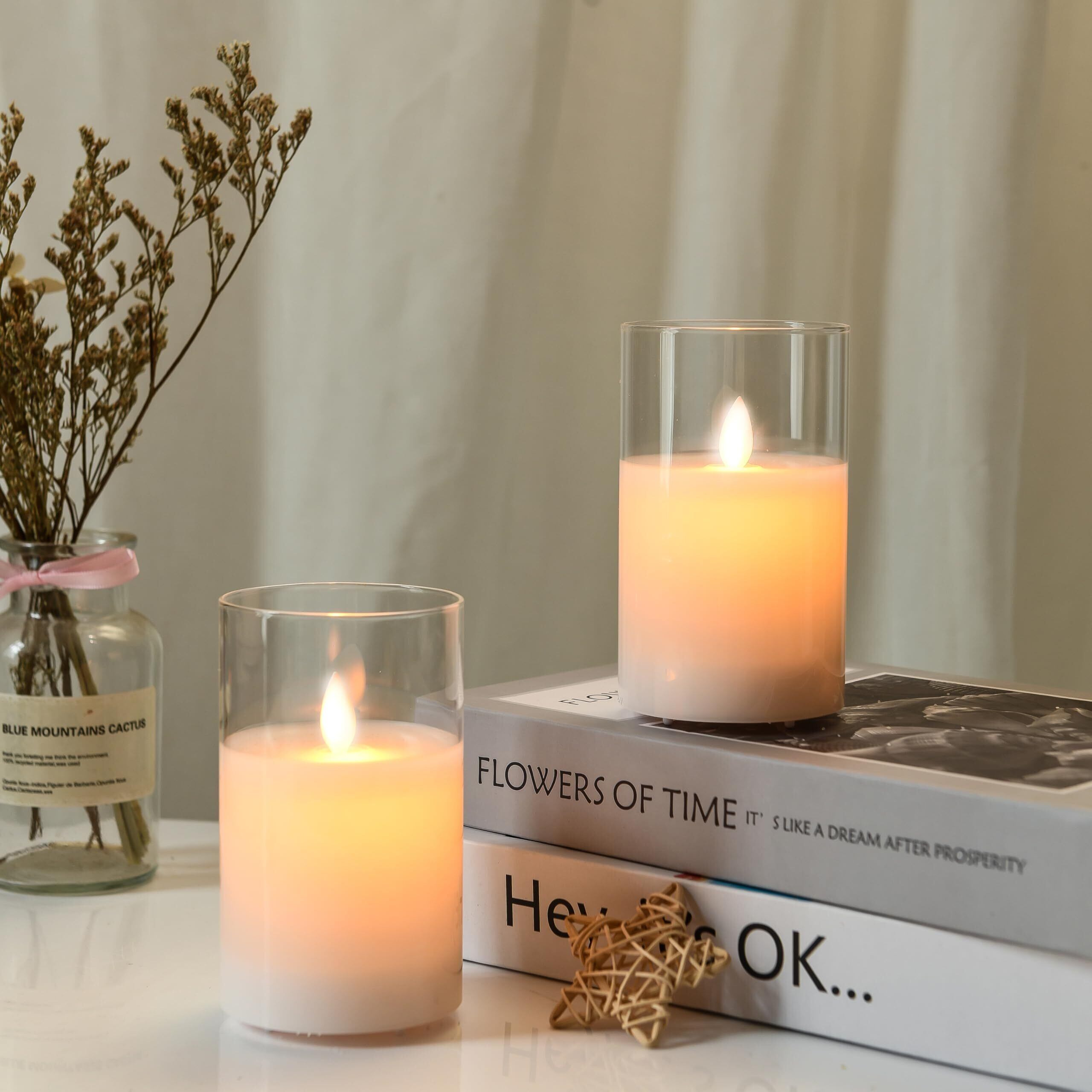 【在庫処分】【2点セット】AnnTec LEDキャンドルライト ロウソク 本物の炎のようにゆらめく 暖色光 火を使わない ゆらゆら揺れる 安全 省エネ 専用リモコン付き 明るさ調整 LEDロウソク LEDキャンドル 電池式 ガラス (直径7.5cm×高さ15cm) (ホワイト) | allstore3
