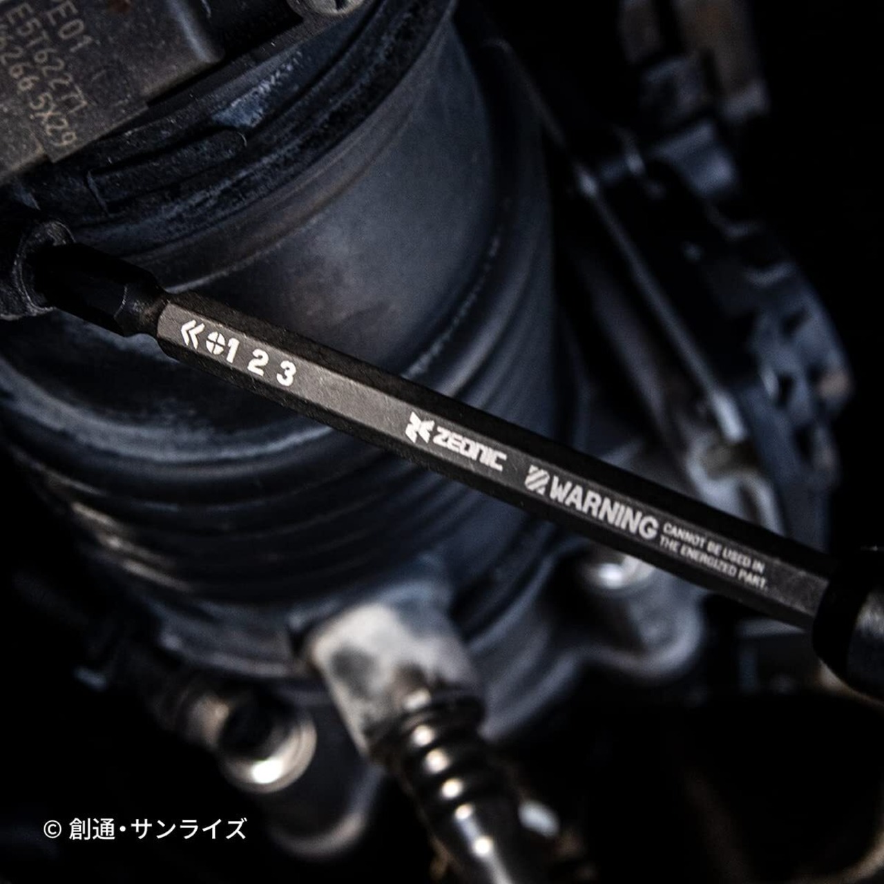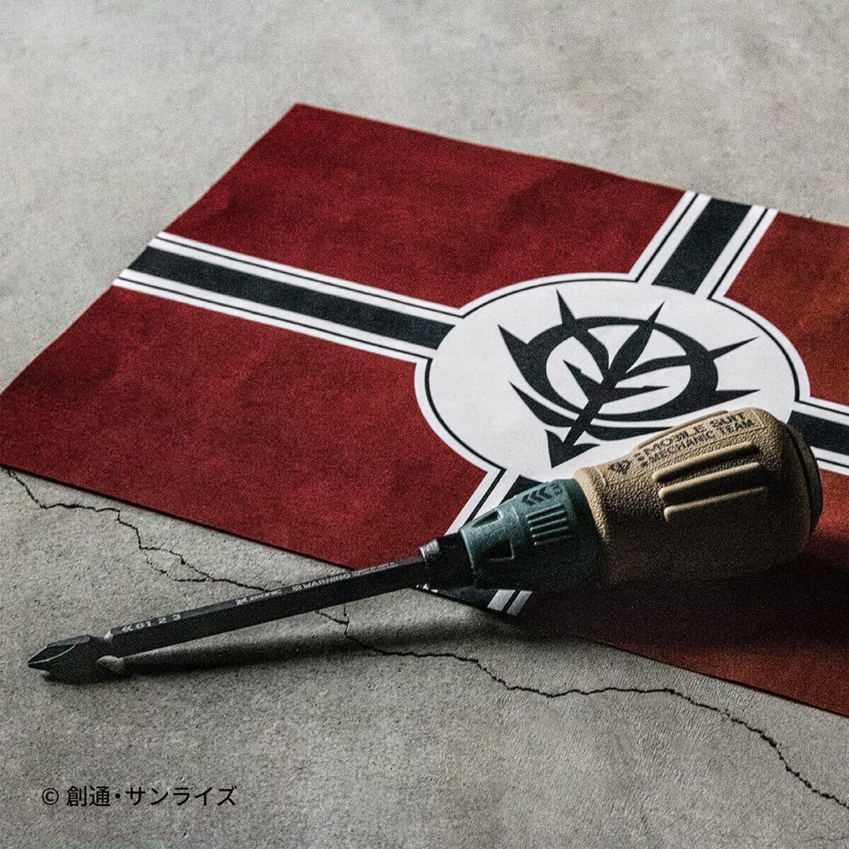 ●ジオン公国軍のメカニック達がモビルスーツの整備に愛用したドライバーをモチーフにした、差し替え式2WAYドライバー。ガルマ・ザビ大佐率いる地球方面軍、その第2地上機動師団の一般兵たちに支給されたモデルをイメージ。●軸を引き抜いて差し替えることで+1、+2、+3、-6の4つのネジサイズに対応できる。これ一本で一般的なネジすべてに対応。●すべりにくくしっかりとネジにトルクを伝えるクッショングリップを採用。グリップエンドにはジオン公国エンブレムがあしらわれている。●レーザーマーキングによって軸部分に機能説明や警告事項・ジオニック社のロゴ・メカニックチームのサインなどを精密に刻印。●軸先端部分にはマグネット加工を施し、ネジなどの保持が可能。細かなネジの落下などを防ぎ、作業性を向上させる。
