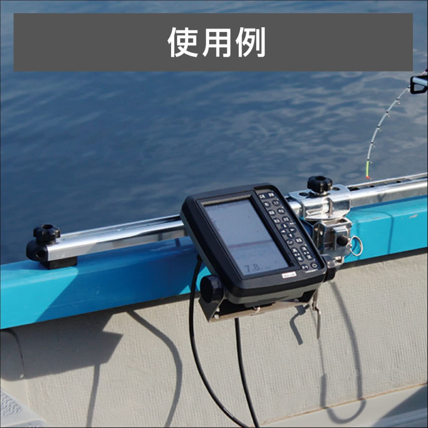 魚探が手前にセット可能! ワカサギボートの必需品! ワカサギレールシステムへHONDEXの折り畳み式魚探を取り付けるための専用アタッチメントです。レールから手前へ魚探を取り付けたい場合に最適です。ステンレス製ボディがしっかりと魚探を支えます。
