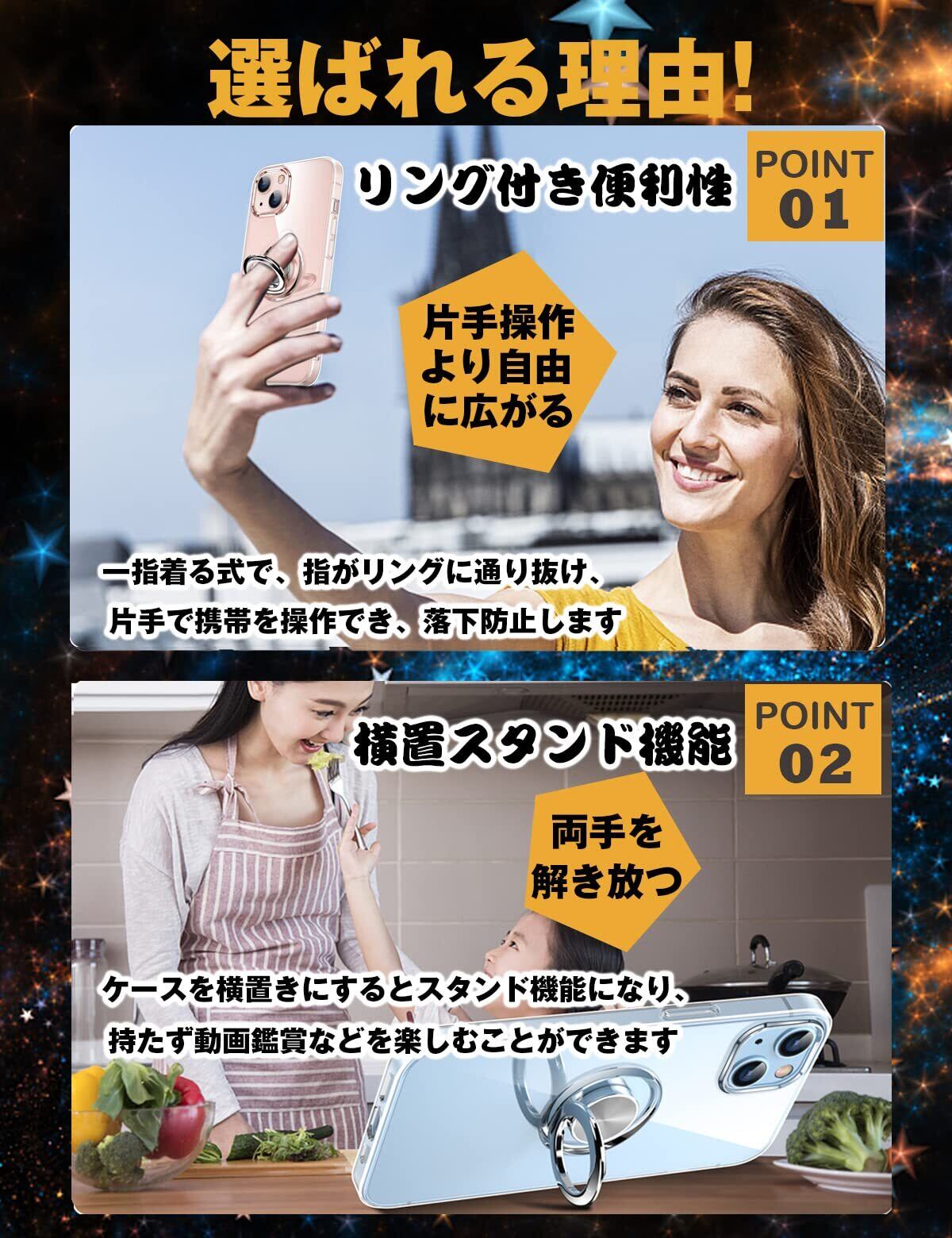 【リング付き機能】ケースを横置きにするとスタンド機能になり、持たず動画鑑賞などを楽しむことができます。リングは360度回転可能、180角度調節可能。一指着る式で、指がリングに通り抜け、片手で携帯を操作でき、落下防止します。