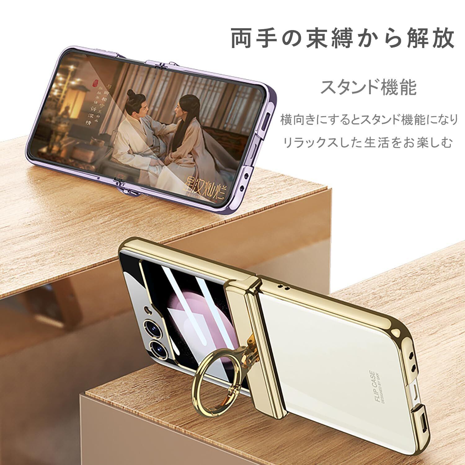 Galaxy Z Flip5 クリア ケース ヒンジ保護 Samsung ギャラクシーZ フリップ5 用 カバー リング付き スタンド機能 Uovon スマホケース 背面に保護フィルム付き ストラップ穴付き メッキ 超軽量 超薄型 おしゃれ · ゴールド