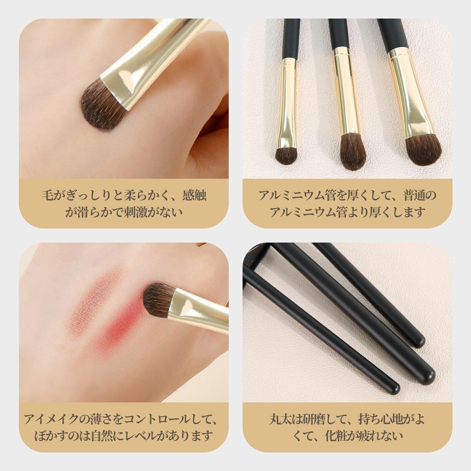 【良質な材質】:アイシャドーブラシは毛は細くて柔らかなものを厳選しており、ブラックの漆塗りの取手は木材を使用、持ちやすく、光沢のあるゴールドのアルミニウム管を使用し。平たい形状の筆なので、上まぶただけでなく下まぶたにも綺麗に色を入れられます。