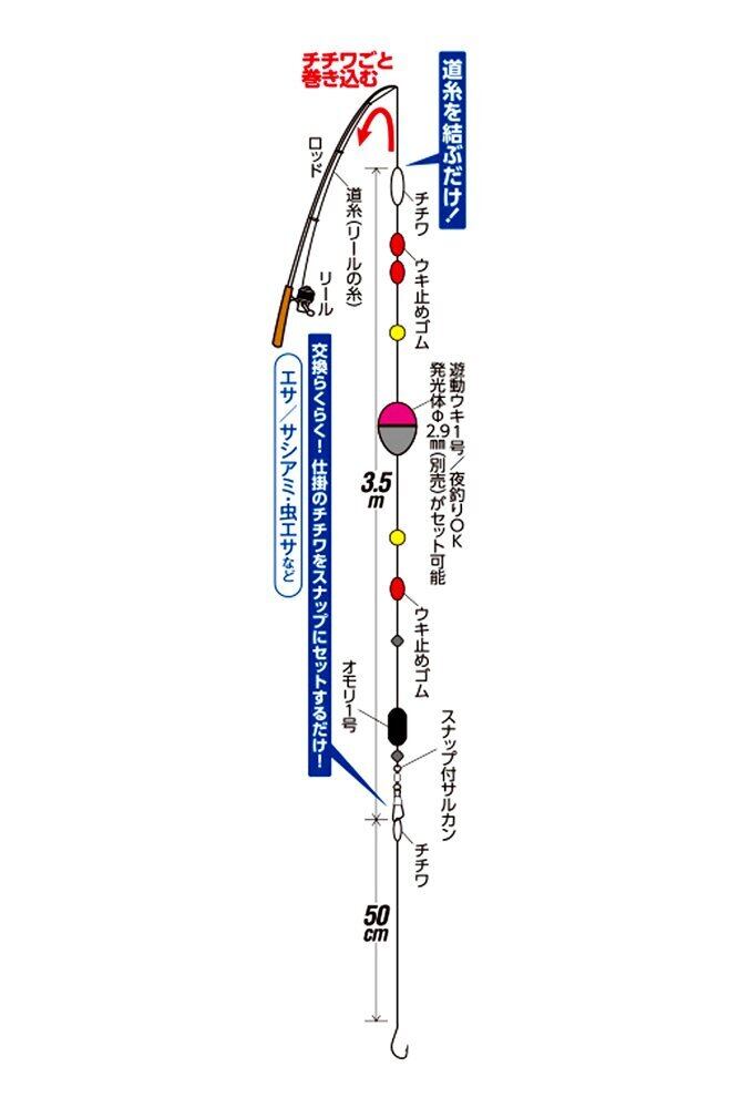 初めてでも簡単! 面倒な仕掛を丸ごとセットしました! 予備仕掛も2本付きで安心です。コンパクトロッド(エギングロッドやバスロッドでもOK)でOK。夜釣りも対応可能な、発光体φ2.9mmセット可能な仕様です。遊動ウキなのでウキ下を50cm~4mまで調整可能で、釣場や狙う魚のタナに応じてウキ下を調整が簡単に行えます。