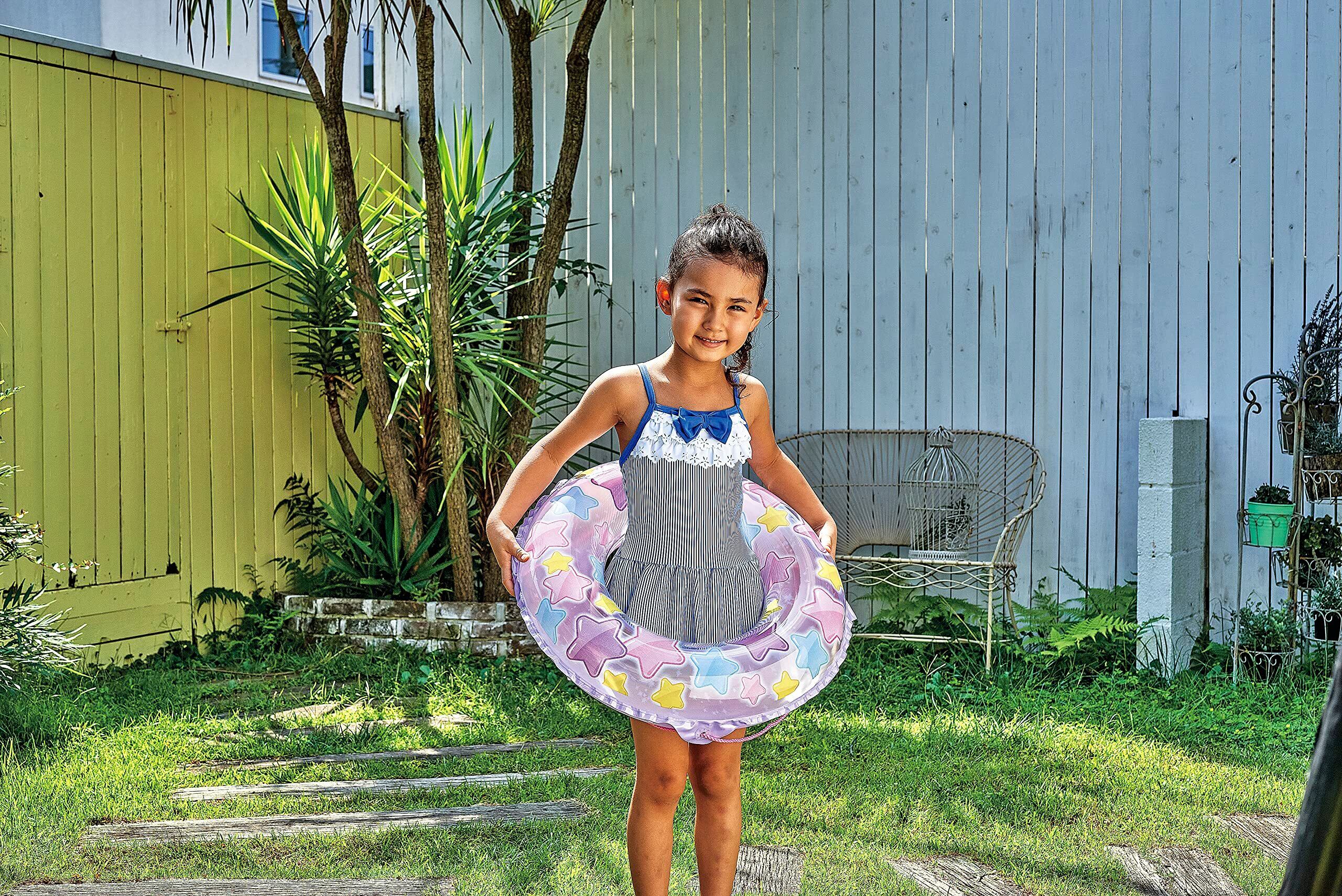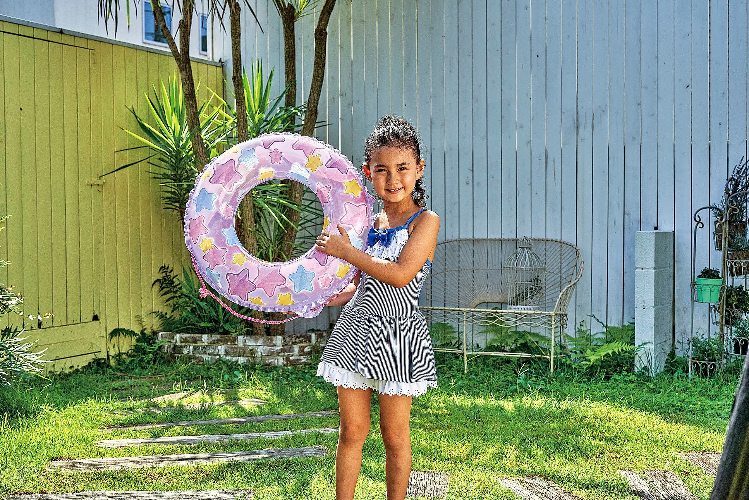 対象年齢3歳~6歳くらいのお子様に最適!。膨らんだ状態のウキワの内周は約80~85cmです。ロープ付き。かんたん空気栓装着商品