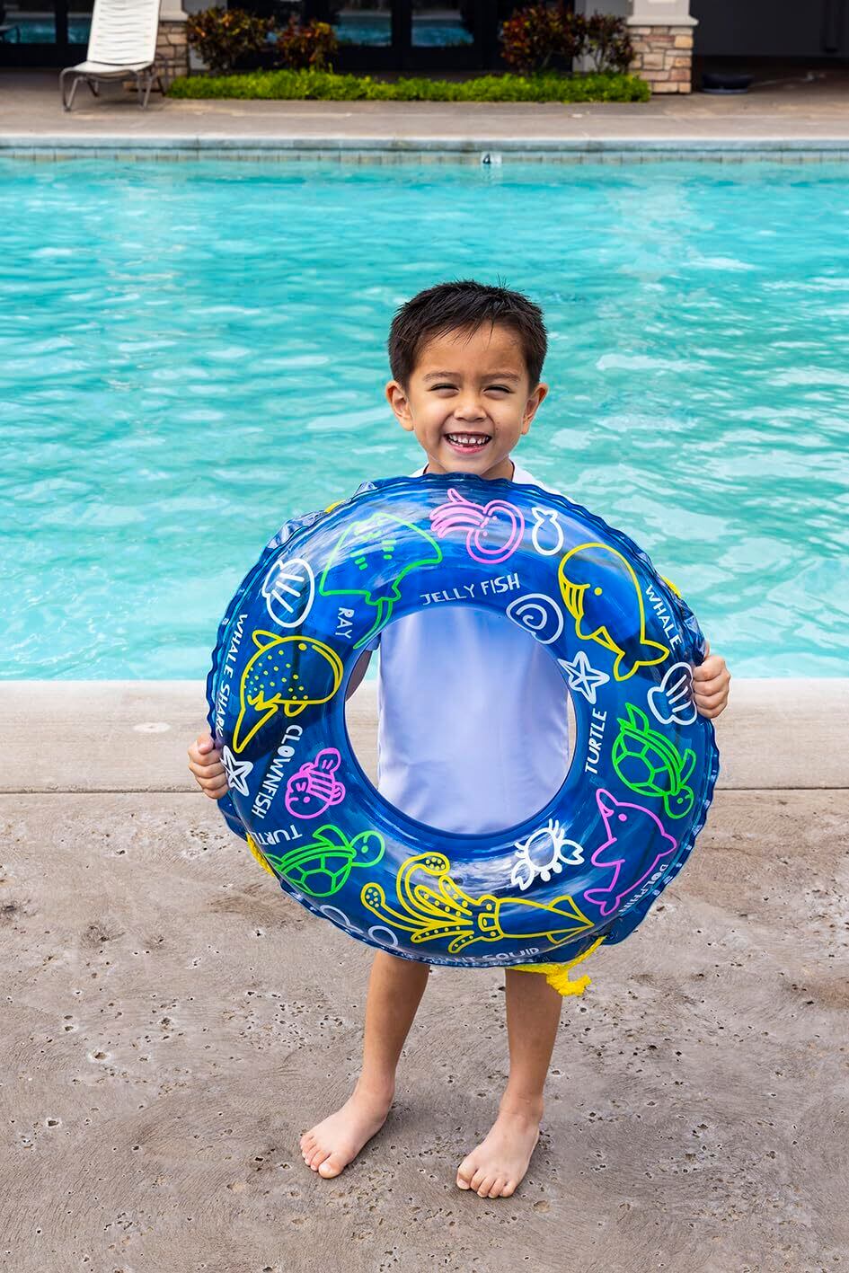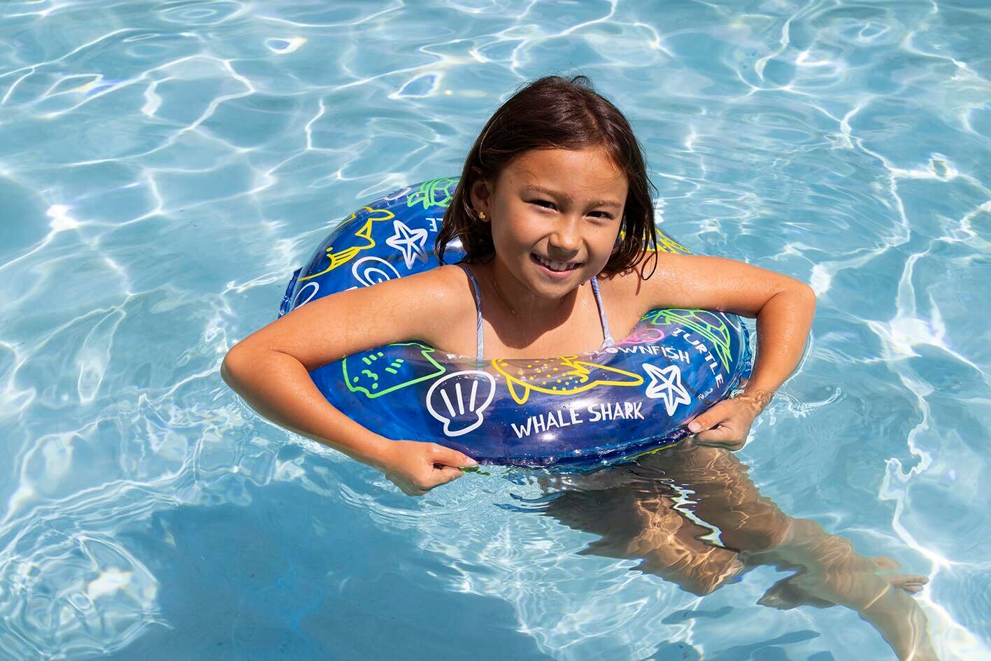 対象年齢3歳~6歳くらいのお子様に最適!。膨らんだ状態のウキワの内周は約80~85cmです。