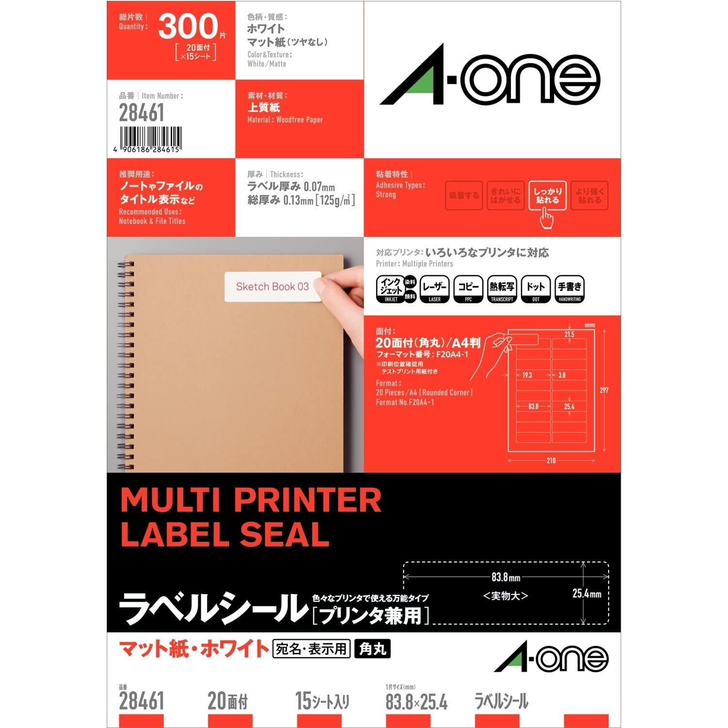 A4判 20面 四辺余白付 角丸/シートサイズ:A4判 (210mm×297mm)/ラベルサイズ:83.8mm×25.4mm(2列×10段)