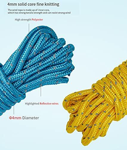 【ガイロープ】径が4mmなので、しっかりしている、200kgまでの荷重に耐えられます;夜間の視認に効果的な反射素材入りテントロープで、昼間でもしっかり目立つようベースカラーは蛍光色となっております。