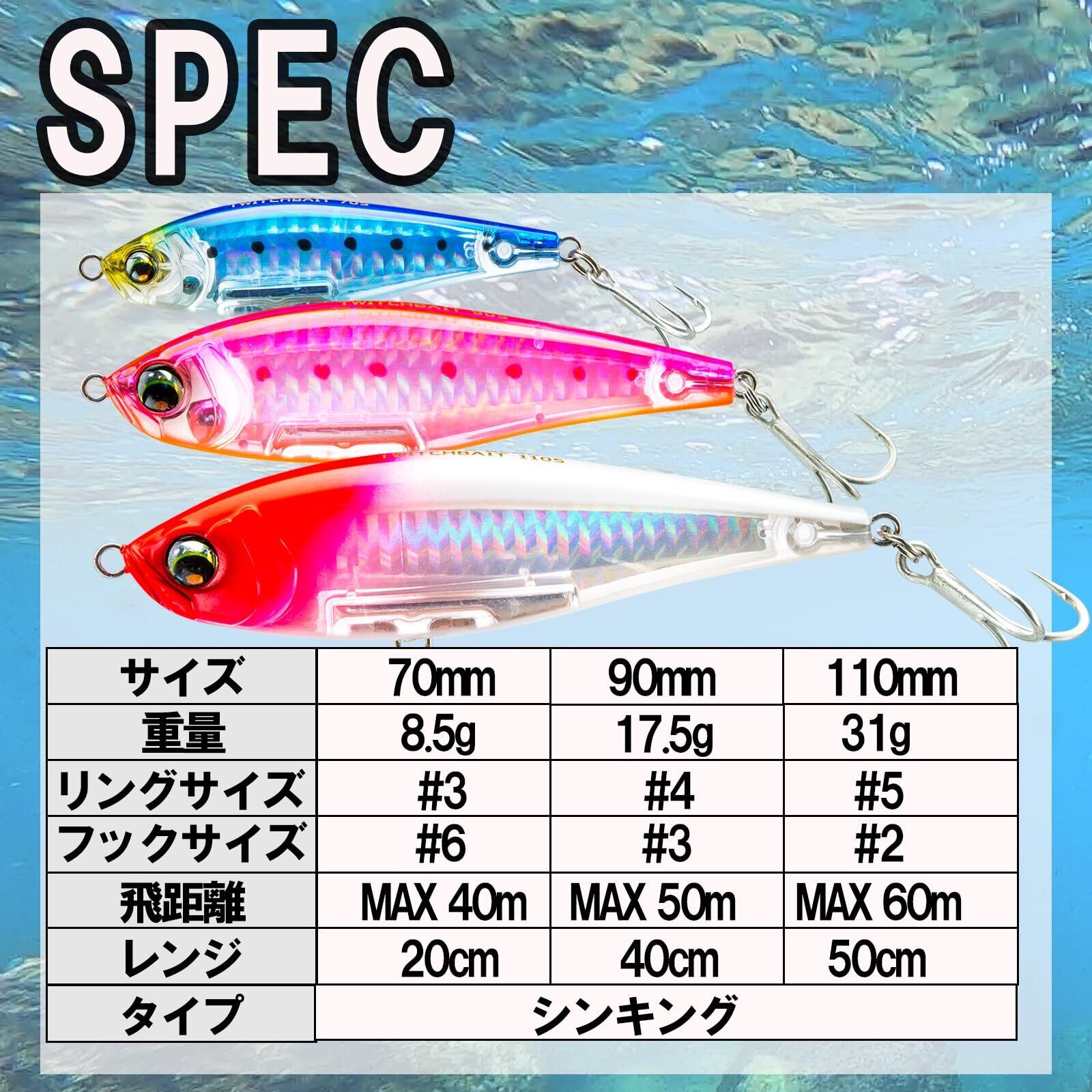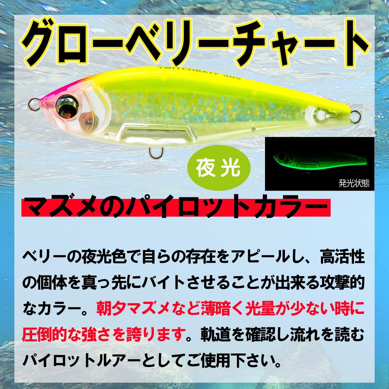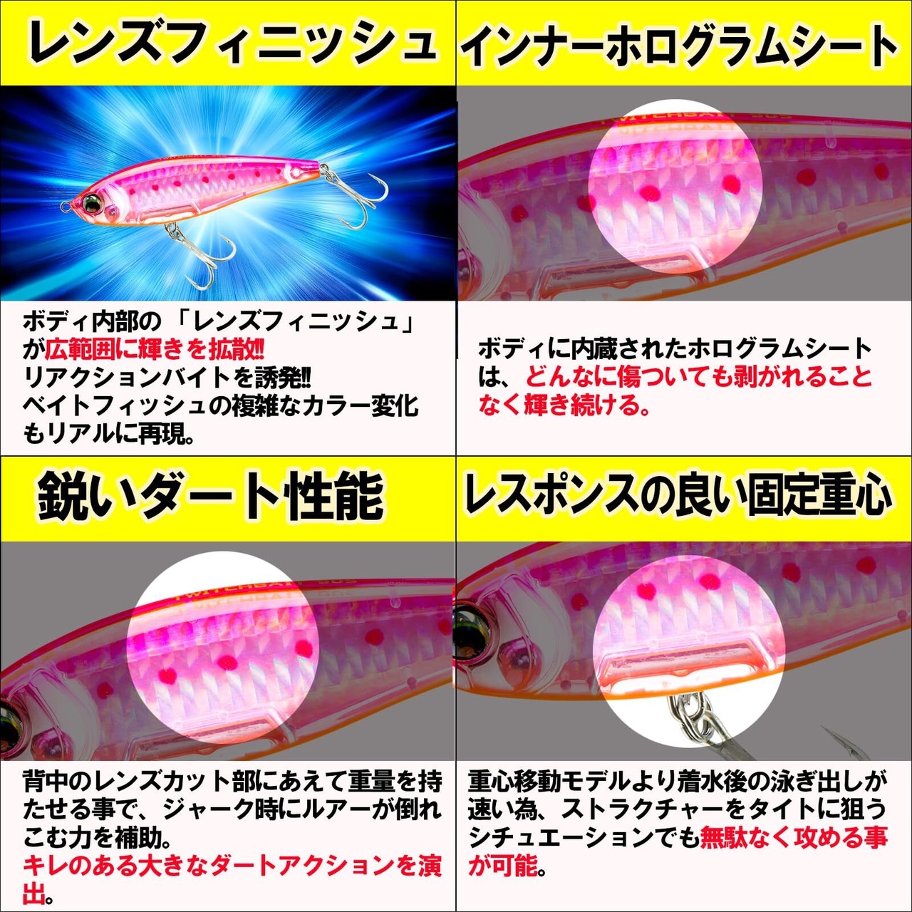 ◆着水後は4回トゥイッチ→1秒ポーズの簡単操作で楽しめる新感覚ルアー。◆ただ巻きスローリトリーブではI字系アクション、速度を上げるとローリングアクションに変化。◆ゆっくり沈むスローシンキング仕様なので、シャローエリアの攻略にも最適。