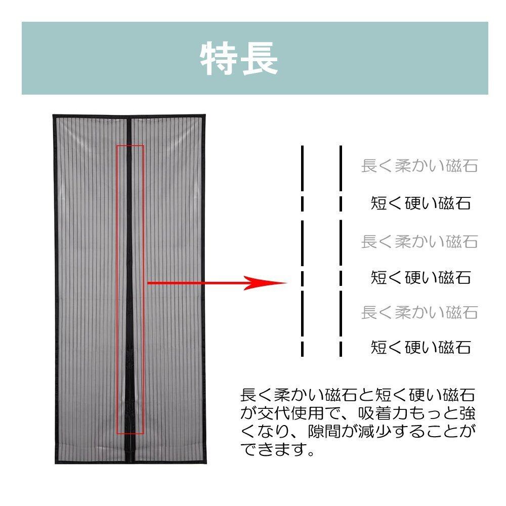 「自動開閉」26個強力マグネットで、手を使わなくても、瞬間に自動閉めることができます。両手を解放し、荷物の運びなどにも便利です。自動的に開閉式なので、風通しが良くて、子供とペットでも簡単に通り抜ける網戸です。