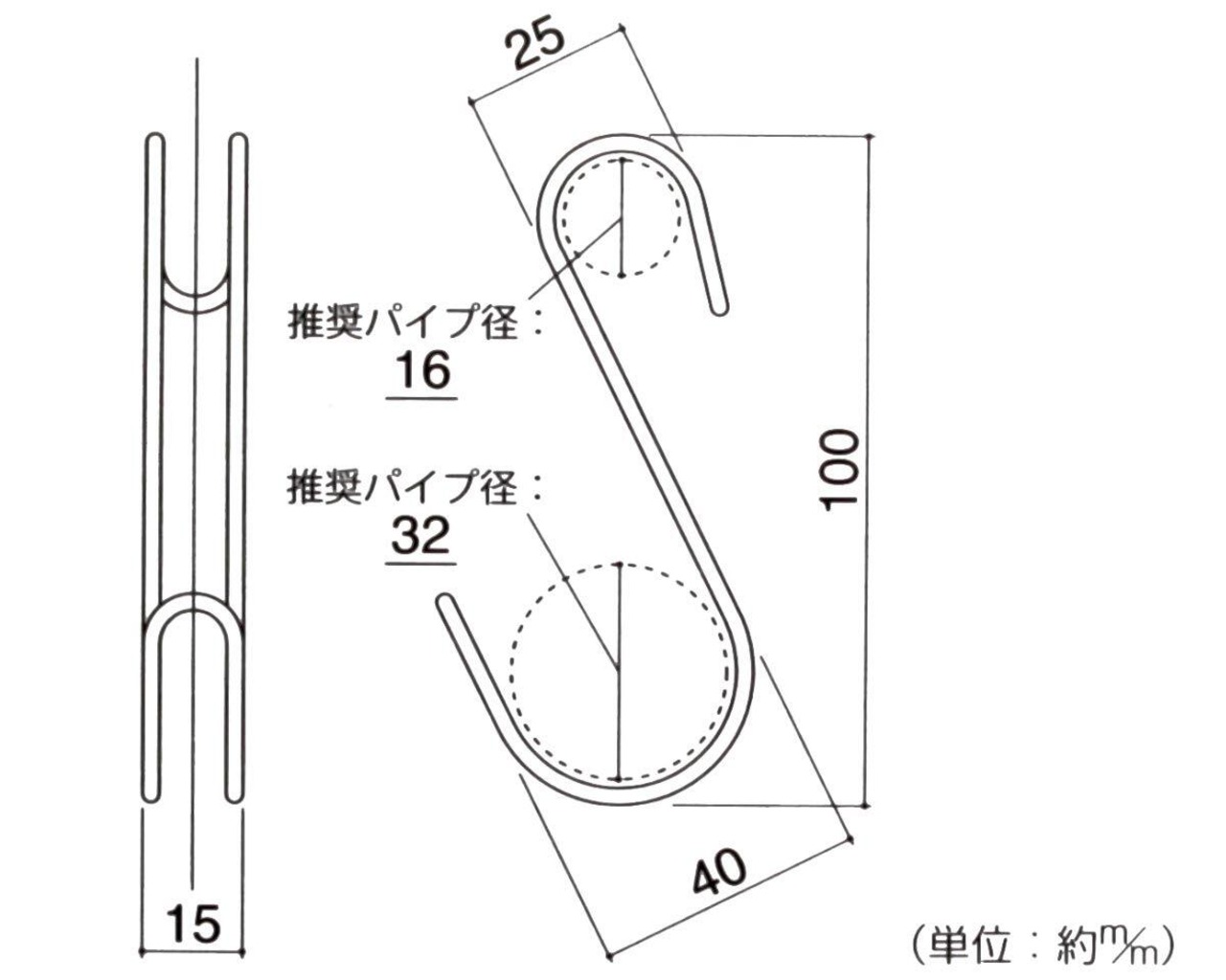 横ブレしづらいSカン●二本線の構造になっているため、一本線のS字フックよりパイプにかけたときに横にぶれづらくなっています