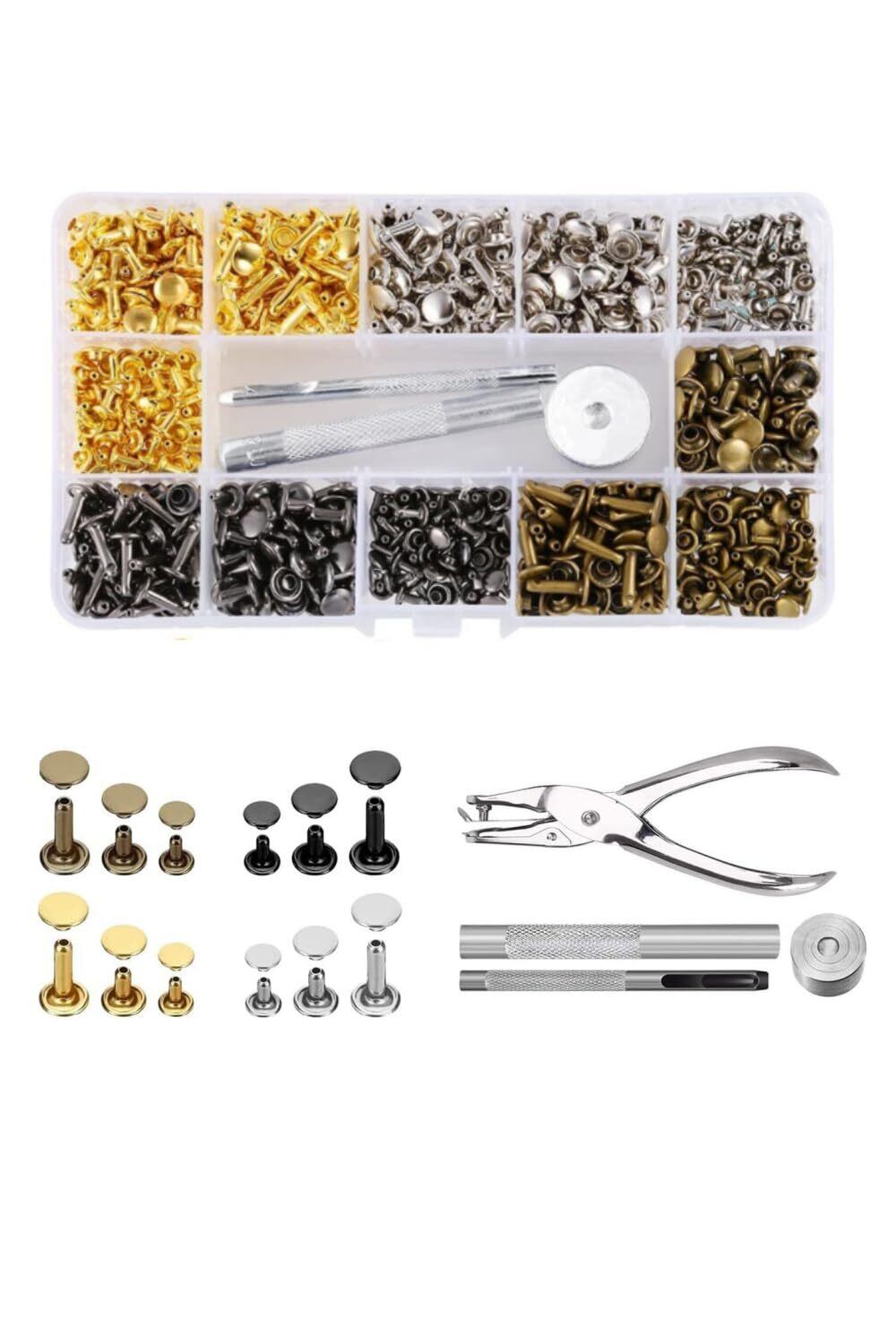 レザークラフト カシメセット 3サイズ 4種色リベット スタッズ 底鋲 打ち具セット 丸形6mm 8mm 12mm 穴あけ 打ち具 打ち台 パーツ DIY 手作り ベルト 布革細工 靴 ジーンズカバン 収納ケース付き (360組)