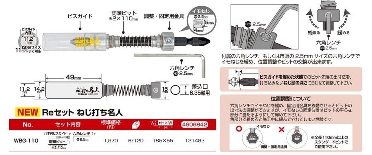セット内容:バネ付きビスガイド、両頭ビット +2×110mm 2.5mm六角レンチ