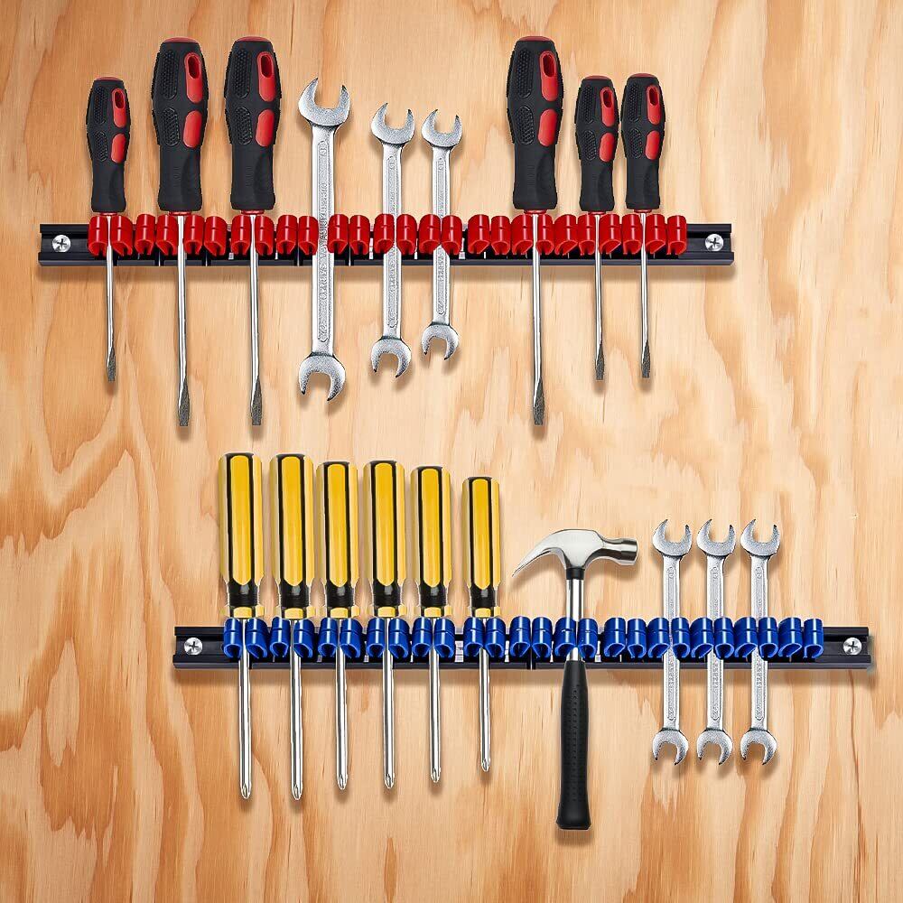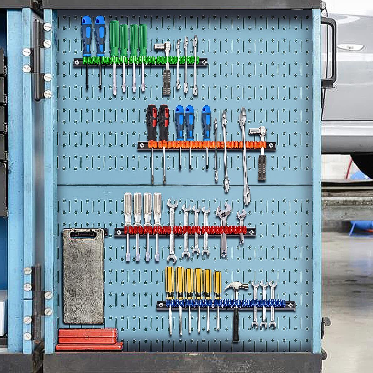 【色々な場所で大活躍】どんどん増えていく工具箱の中身の整理に便利なツールホルダーは、スクリュードライバー、スパナ、エクステンション、プライヤー、ペンチ、ニッパーなど小さな工具を整理し簡単にアクセスできます。また、地下室、オフィス、倉庫、ガレージの壁、キッチンなど。必要とする場所どこにでもツールオーガナイザーを取り付けることができます。省スペースで、引っ掛けも取り出しも便利です。