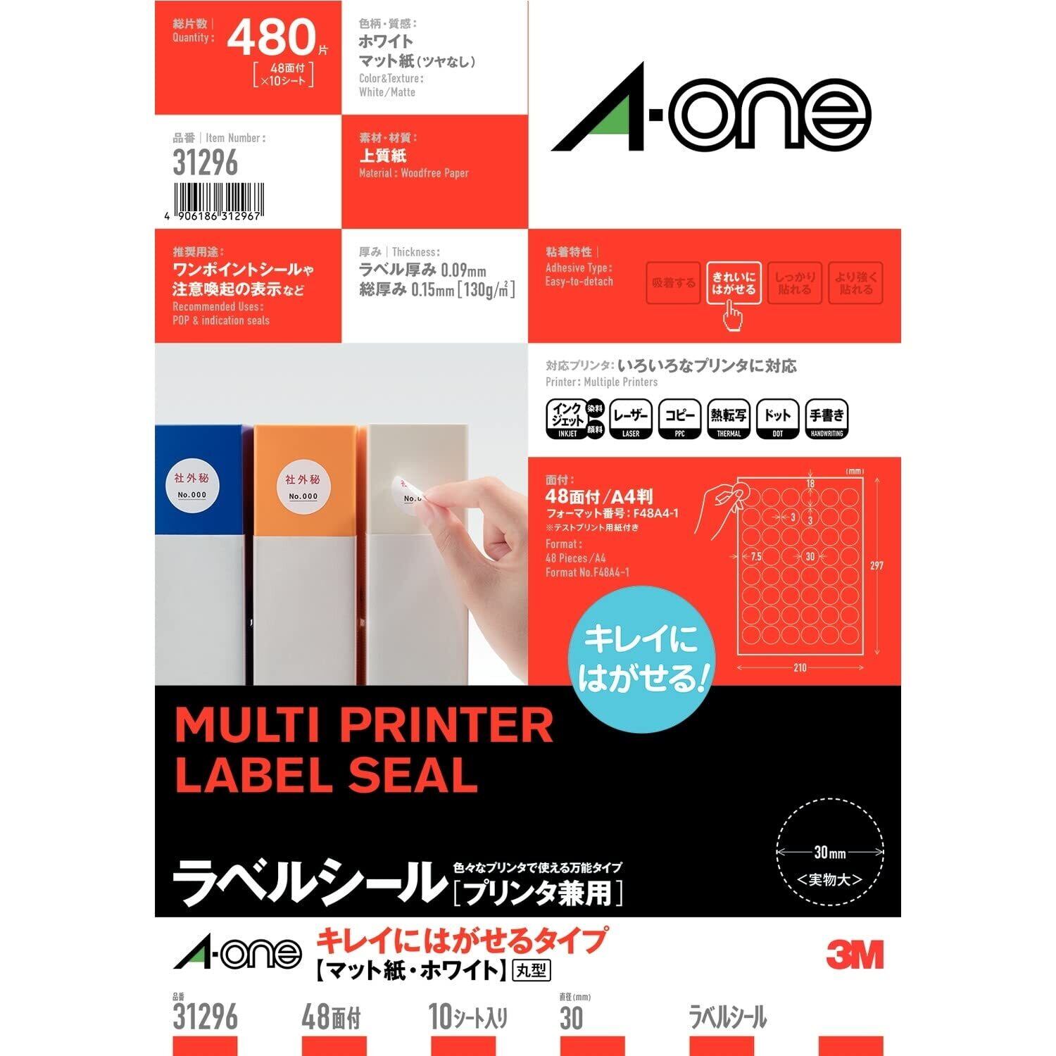 エーワン ラベルシール キレイにはがせるタイプ A4 48面 丸型 10シート 31296