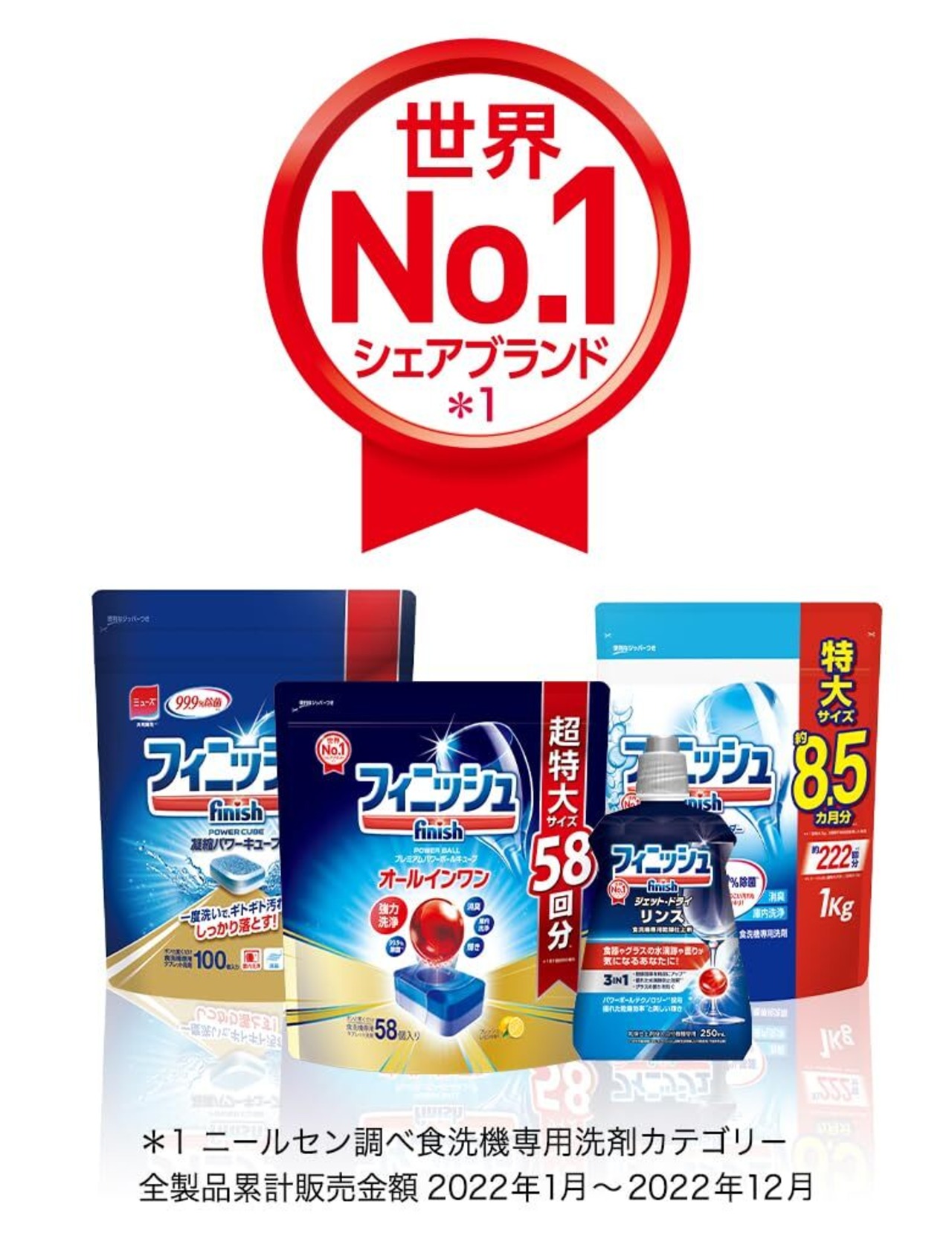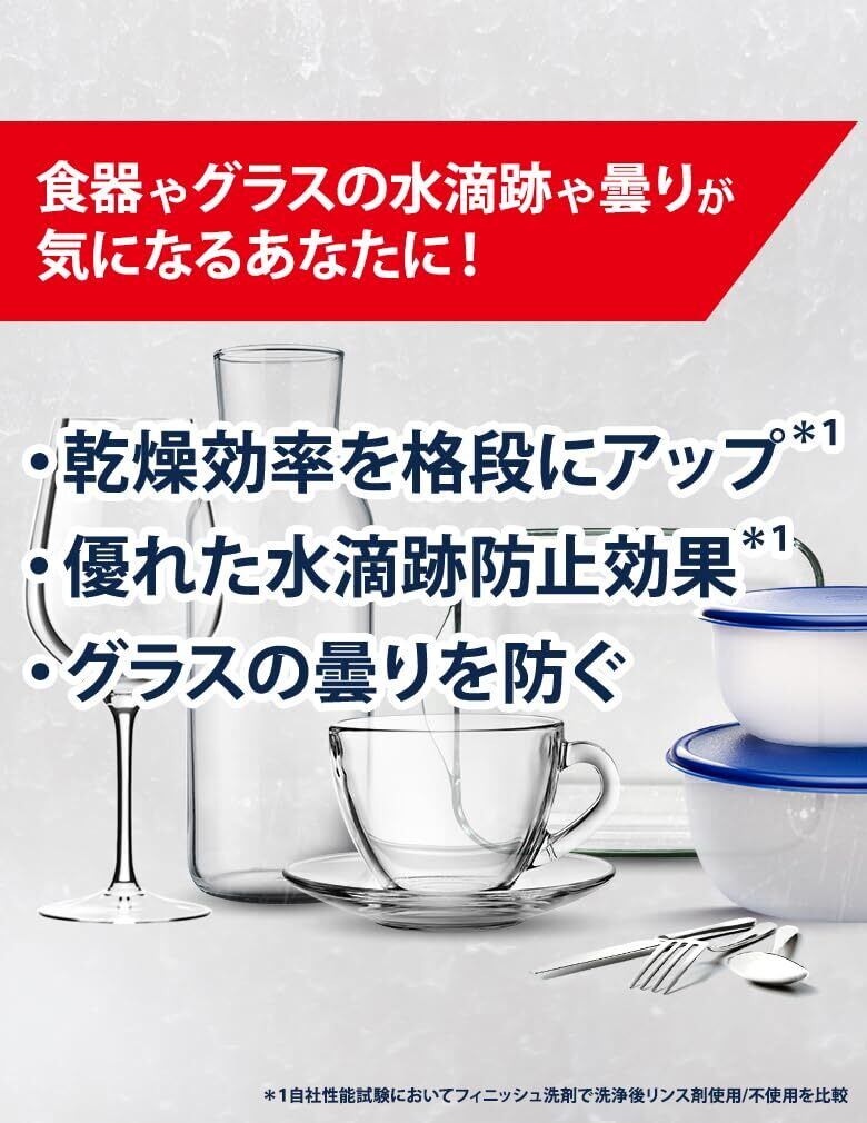 ●国内食洗機推奨ブランドNo.1(※1)を誇る食洗機専用洗剤・フィニッシュ。フィニッシュリンスはグラスと食器にさらに美しい輝きを与える乾燥仕上剤です。
