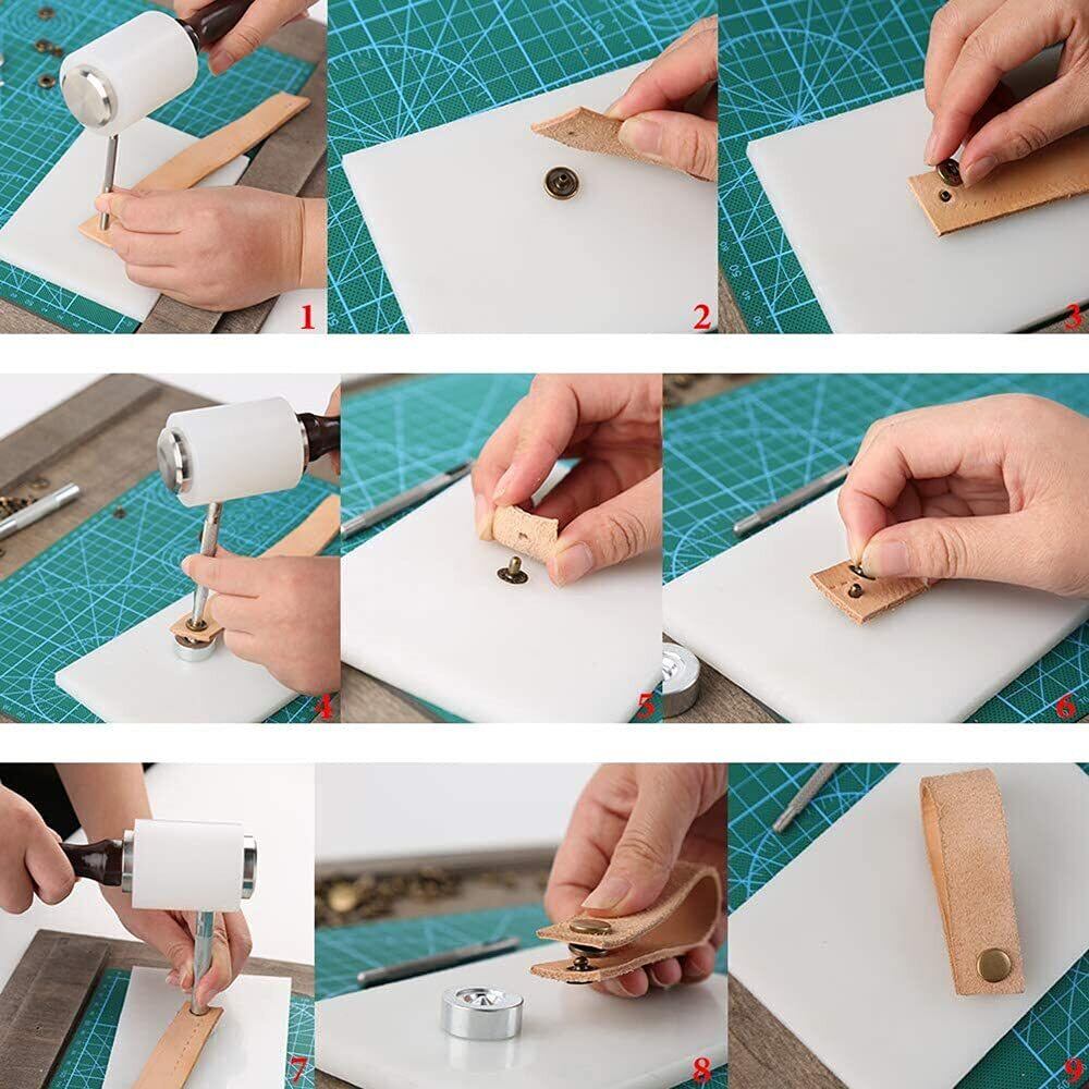 商品仕様:ホック18組と(各セットには4つのパーツ:フロント、メス、オス、バック),レザークラフト工具*4+収納ボックス。
