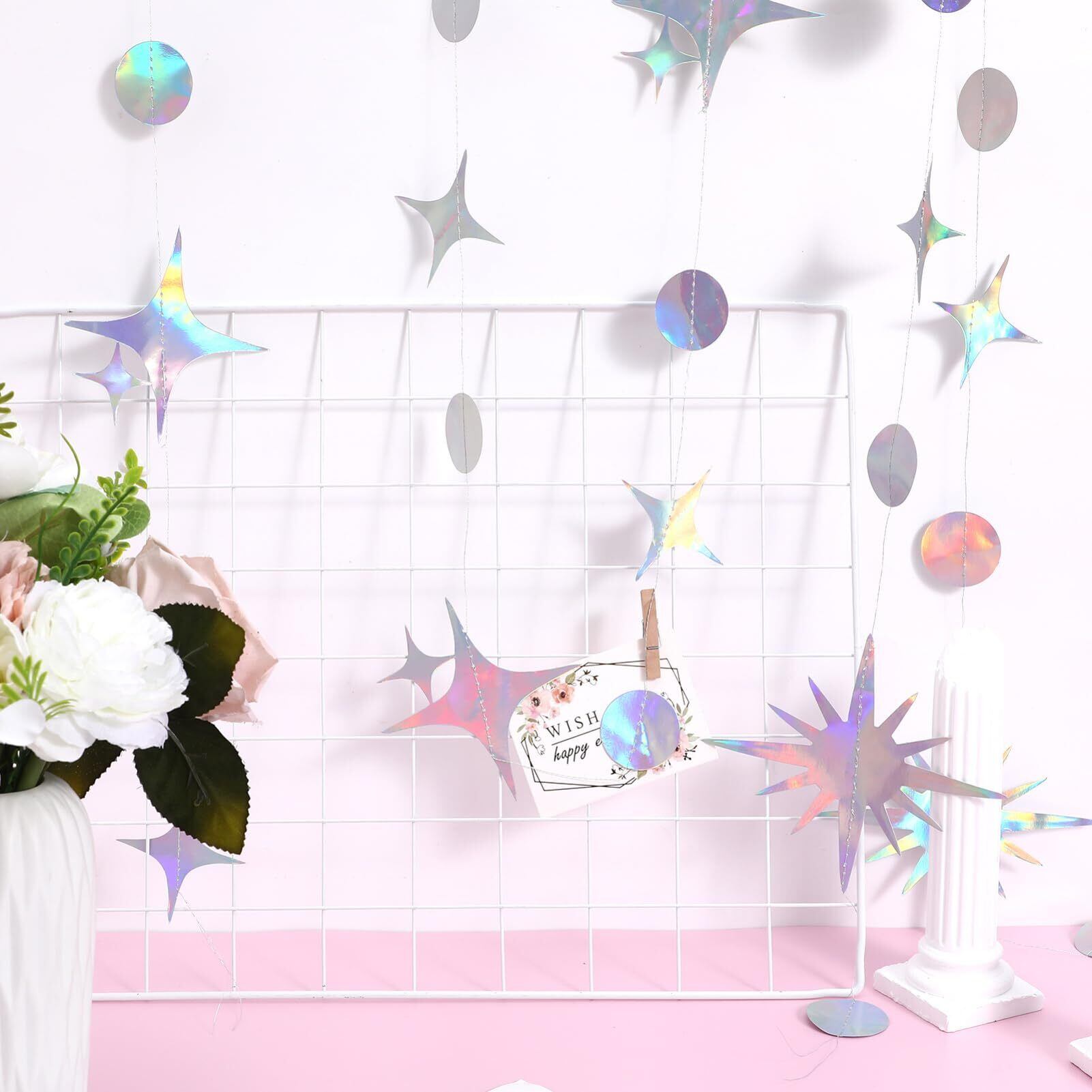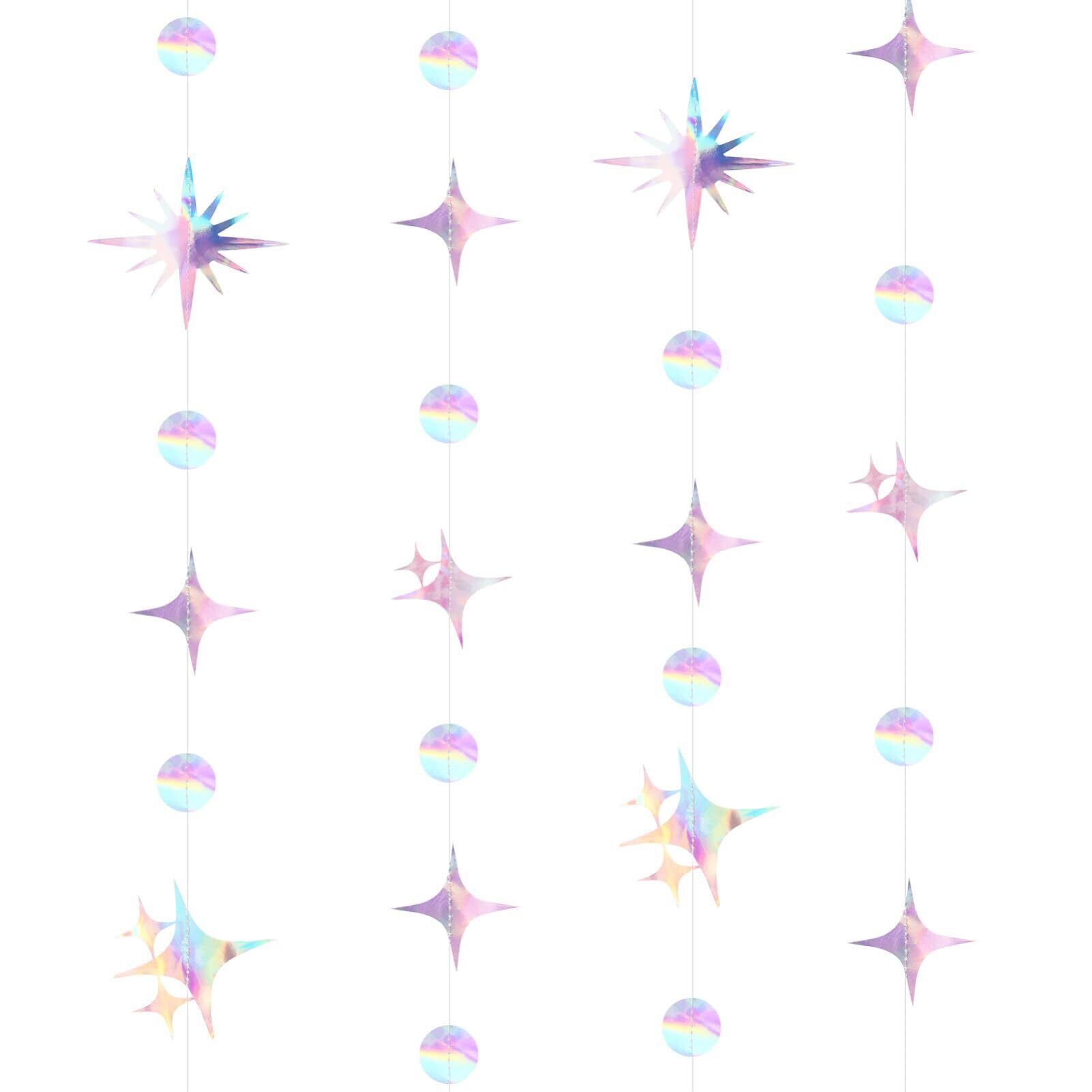 この虹色に輝く ガーランドのセットで、お祝いにちょっとした輝きを加えましょう。誕生日、パーティー、特別な機会に最適なこれらの吊り下げ飾りは、光を美しく するきらめく星とドットが特徴です。天井、出入り口、壁に吊るして、あらゆる年齢層のゲストに喜ばれるお祭りの雰囲気を作り出しましょう。