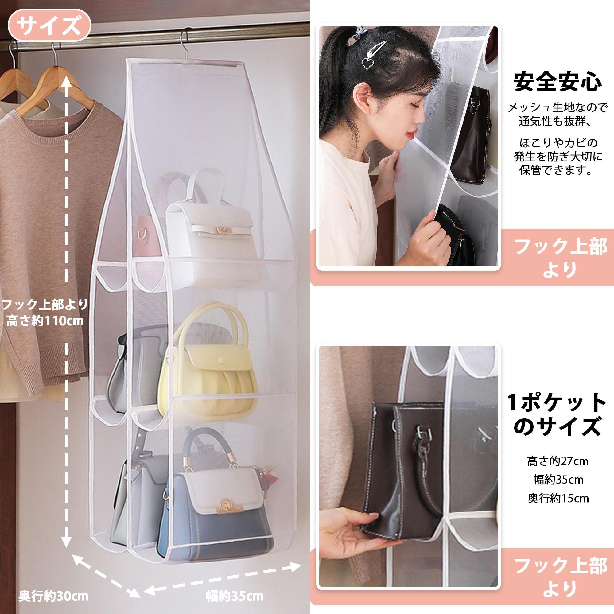 【品質の良い】バッグ ハンガー 通気性も良く、耐久性に優れています。収納ラック 吊り下げは厳選した厚手の耐摩耗性のメッシュ素材で風通しがよく、よく縫合して、丁寧に製造しております。エッジ部分がよく包まれて、糸が破れにくくて、長く使用できます。中身が見やすい。繰り返して水洗っても形が変わらなく、フェードしません。バック収納 吊り下げ カバンかけ 安全で健康的で耐久性があり、美しく実用的で。