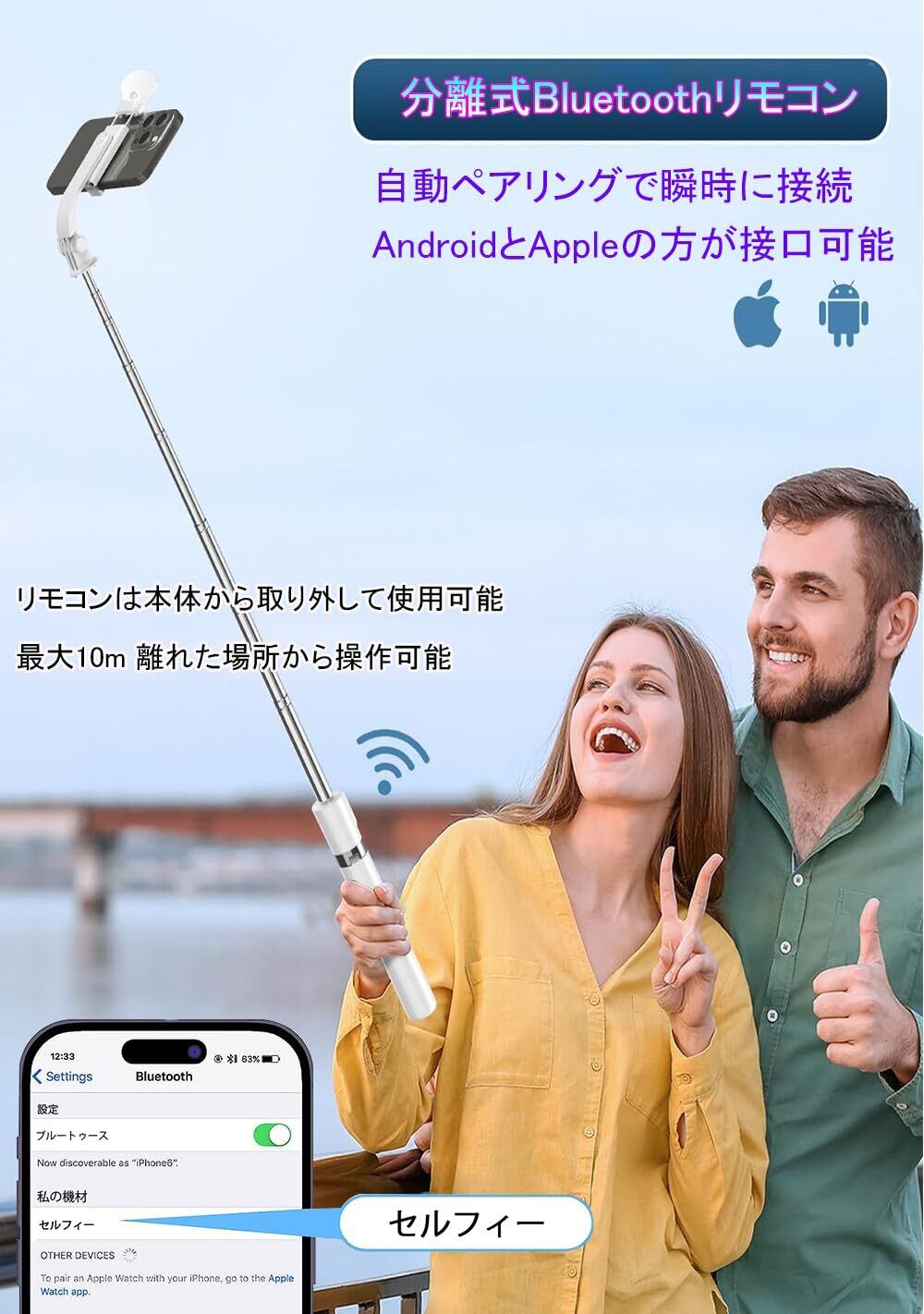 【0遅延で写真を撮れる】自撮り棒の無線リモコンは最先端ブルートゥース5.2技術を採用、通信範囲や伝送速度が大幅にアップするため、境に左右されない優れた接続安定性を実現していて、ワンタップですぐに撮れる、遅延、途切れがありません。10m遠隔撮影が対応、家族写真、一人旅など素晴らしい全身写真が実現できます。*ブルートゥース機能が搭載されるAndroidとiOSのスマホに対応可能です。