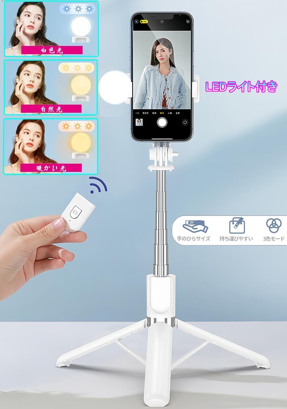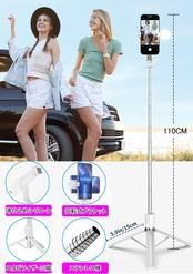 【7段階伸縮・LEDライト付じどり棒】範囲が広いため様々な場所で撮影可能。ボール雲台は360度の回転ができ自由に角度を変えれます。しっかりと固定されるので横向きはもちろん縦向きや斜めにと好きな角度に調節できます。充電式3段階LED付き。シーンに合わせて3色の調光ができます。ライトにより美肌効果が生まれるため、自撮りはもちろんライブ、ビデオ撮影でより美しく撮影ができます。注意:固定したスマホの位置は360度自由に回転できますが、自撮り棒の接続部は225度までしか上下できません。