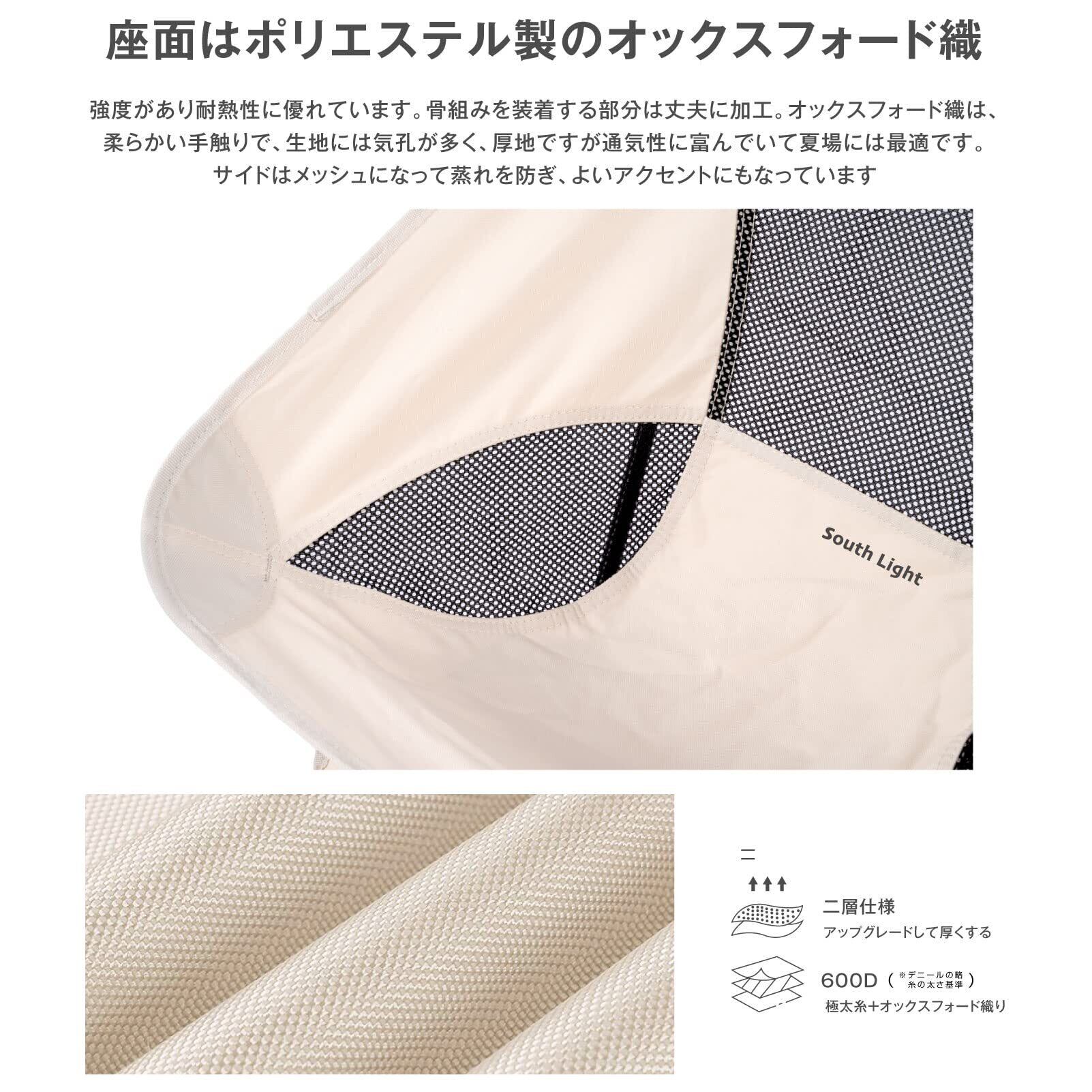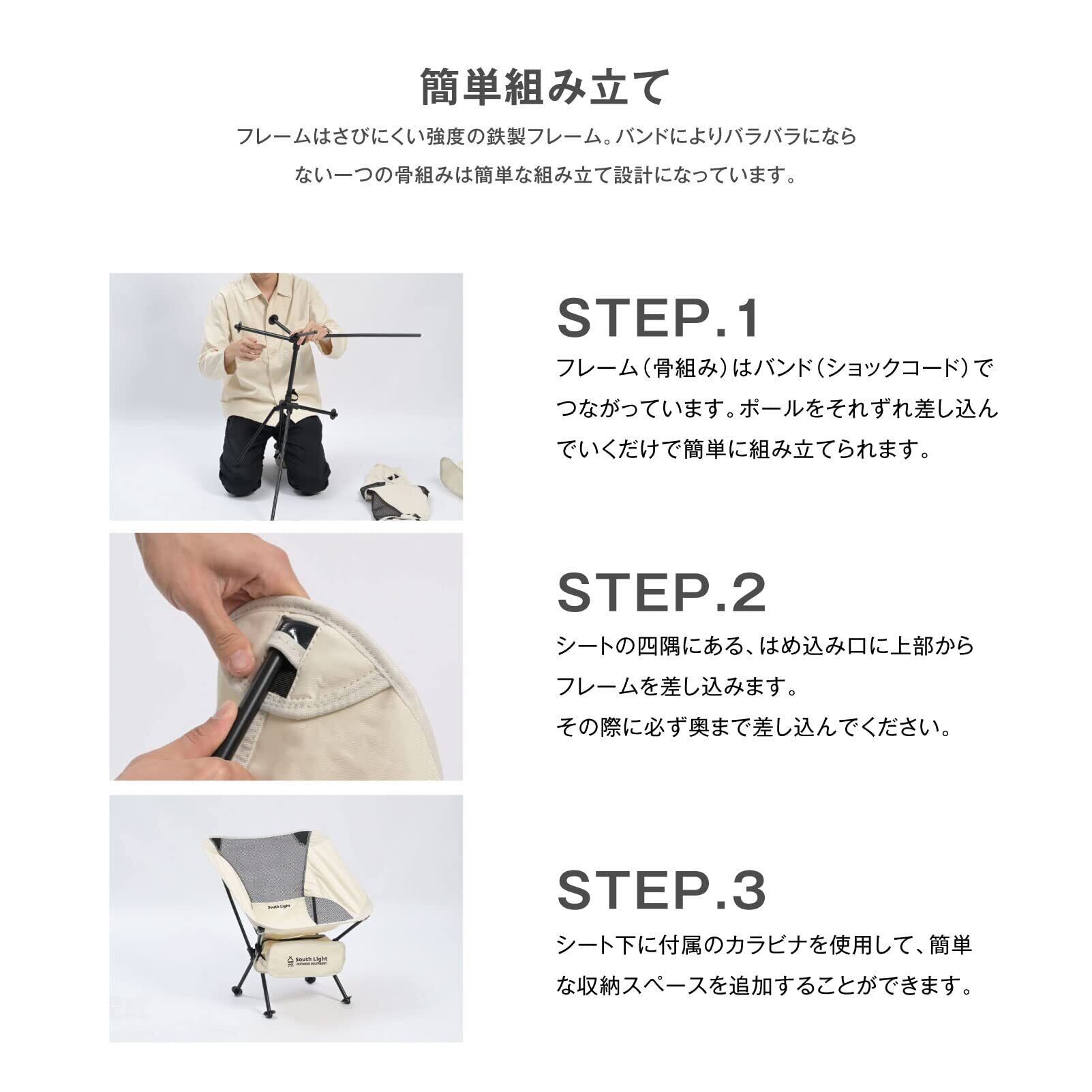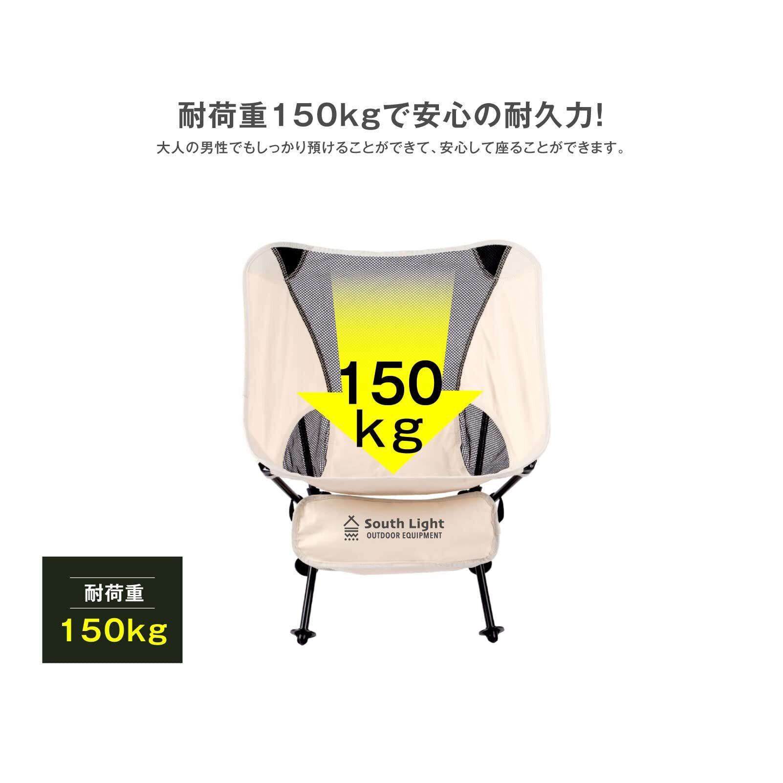 【キャンプ・レジャー / 小型組み立て式簡易チェア】キャンプやレジャーなど快適なSouth Lightの小型の組み立て式チェアです。座面部分と骨組みの一人用タイプですが、耐荷重は150kg。体重をしっかり預けることができますので安心して身を任せることができます。全身を包み込んでリラックスできる座り心地です。座面高さ41cmは高すぎず、焚き火やローテーブルにぴったり。テント内でも隅に寄せて使えますので、テント内のスペースをより有効に使うことができます。