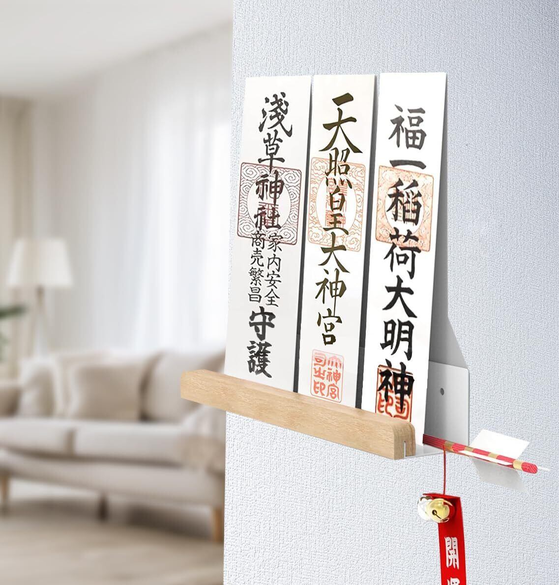 【御札立て・簡易神棚】女性一人でも取り付けやすい軽量設計で、どなたでも五分ほどでお取り付けできます。マンションやアパートなどの比較的狭い空間でも圧迫感がありません。神札や破魔矢をもらっても神棚がなく、お祀りする場所に困っている方にオススメです。