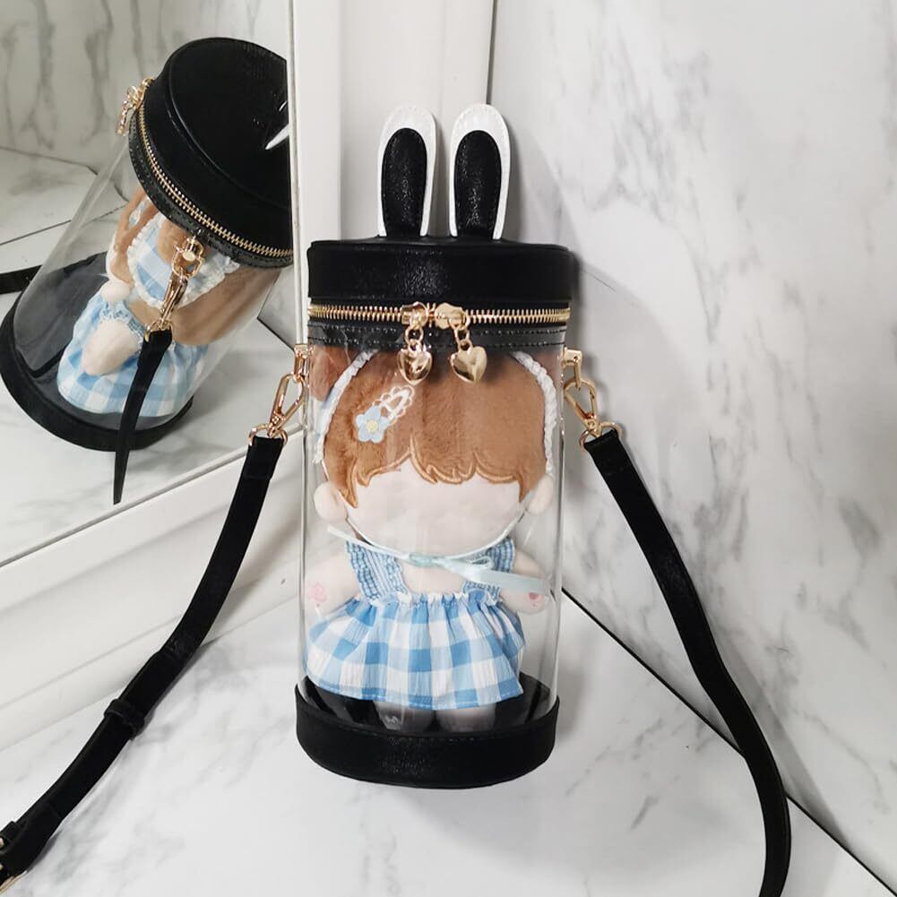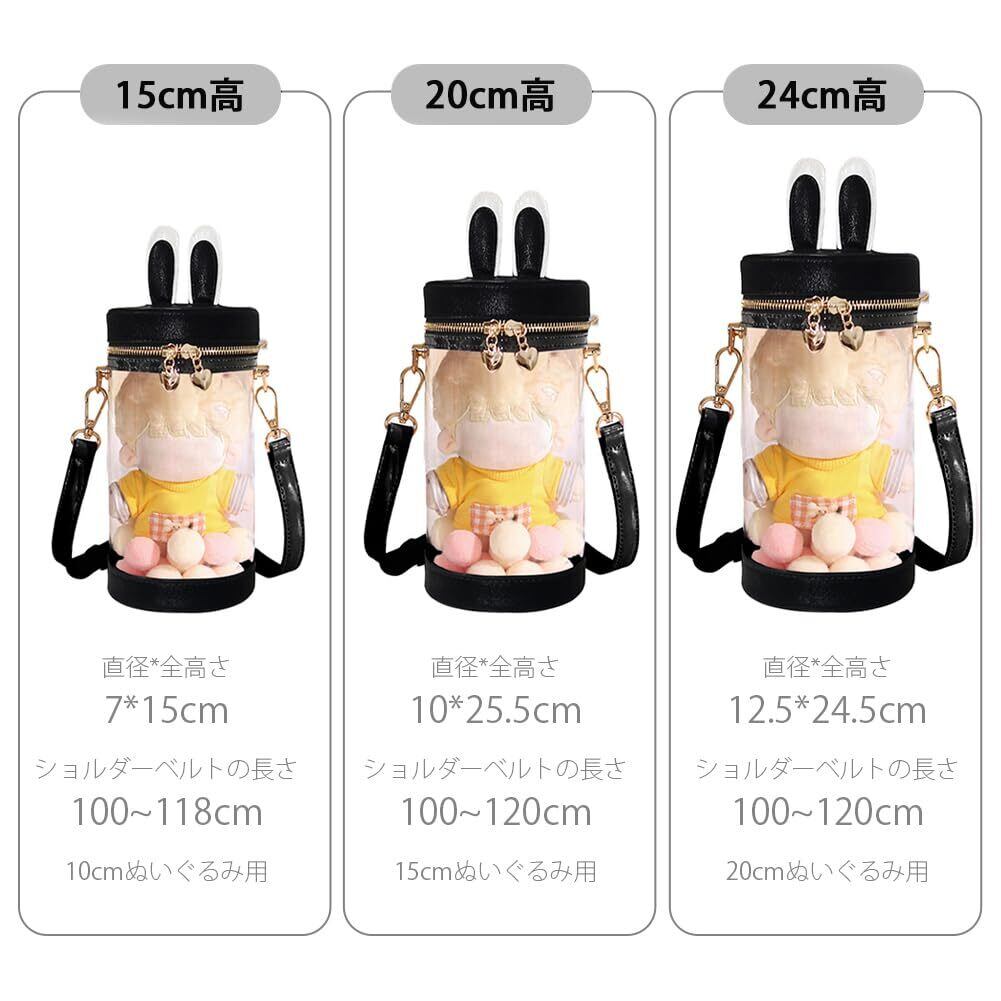 外観:バッグの蓋はウサギ耳付き、バッグの底部は全面の透明デザイン、内部に見せたいアイテムを好みにアレンジでき、水と塵からぬいぐるみなどを保護しくれます。円筒形バッグ、蓋はジッパーのデザイン。ショルダーストラップ付きます。
