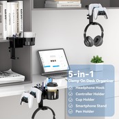 KDD 5 in 1デスクオーガナイザー—回転式ヘッドホンスタンド—取り外し可能なコントローラーホルダー—ペン立てとカップホルダー付き—卓上収納がカップ、スマホ、ペン、コントローラーとヘッドホンに適用。(黒い)