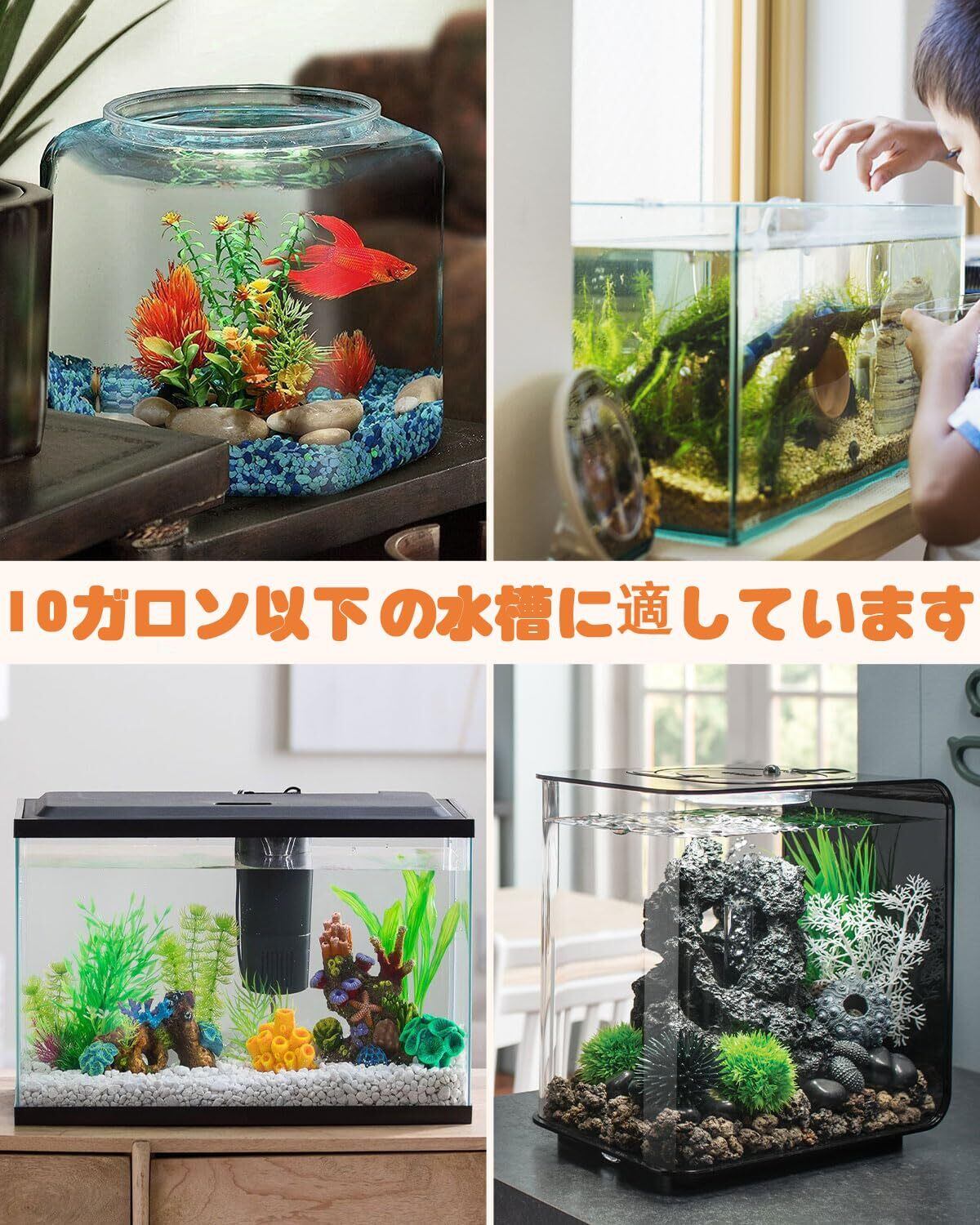 多機能水槽掃除ブラシ:吸水口保護カバーを備え、稚魚やエビが吸い取られるのを効果的に防止する。多機能クリーニングヘッドにはミニブラシとマットが付いている。排水時には、装飾拭き、汚れ、糞の除去、壁拭きに最適です。