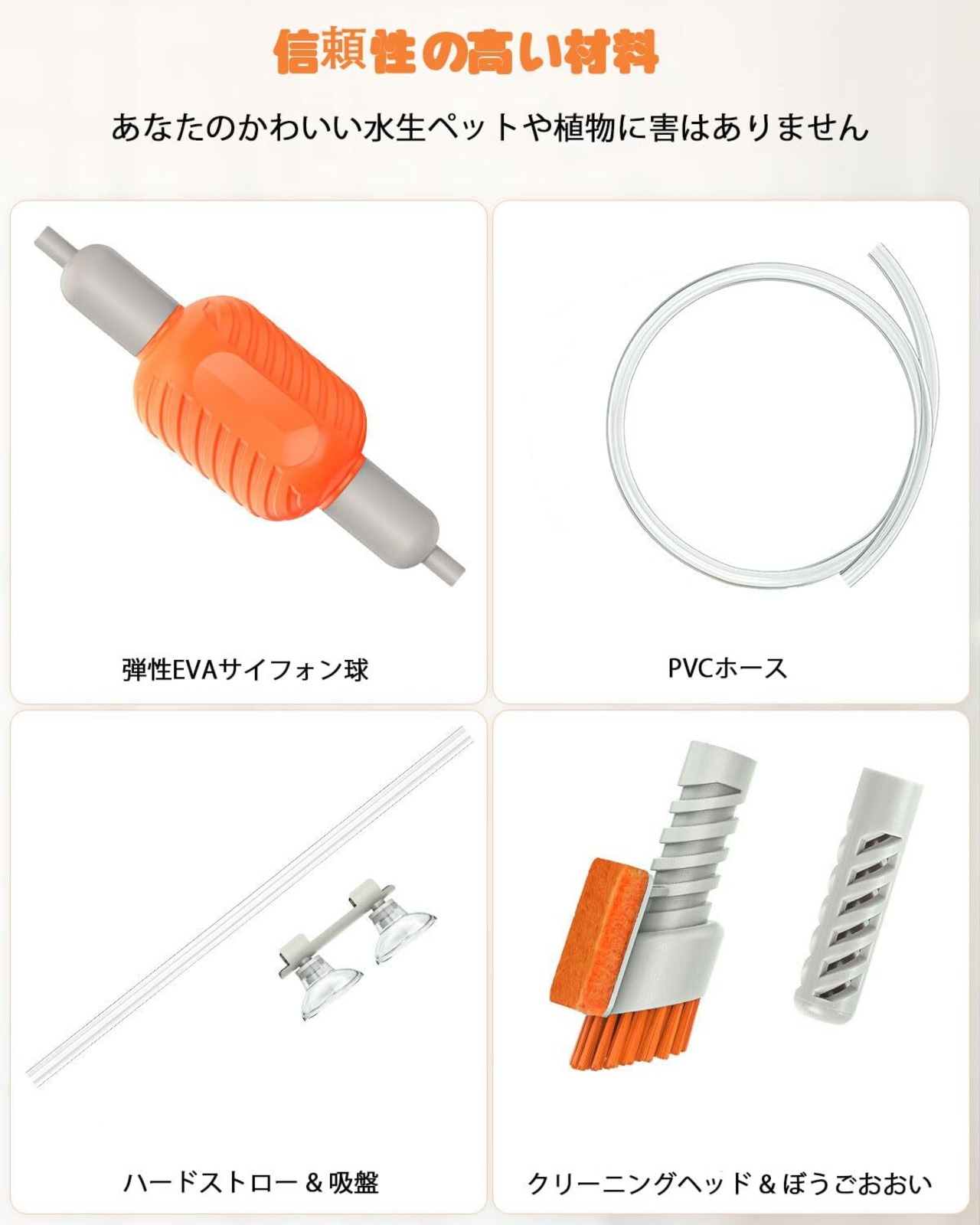 信頼性の高い材料:水槽の真空は透明なPVCチューブと優れた弾性を持つEVAサイフォンボールから構成されている。エアバッグの両端は取り外し可能で、清潔さと通気性に優れています。あなたの水生ペットには無害です。