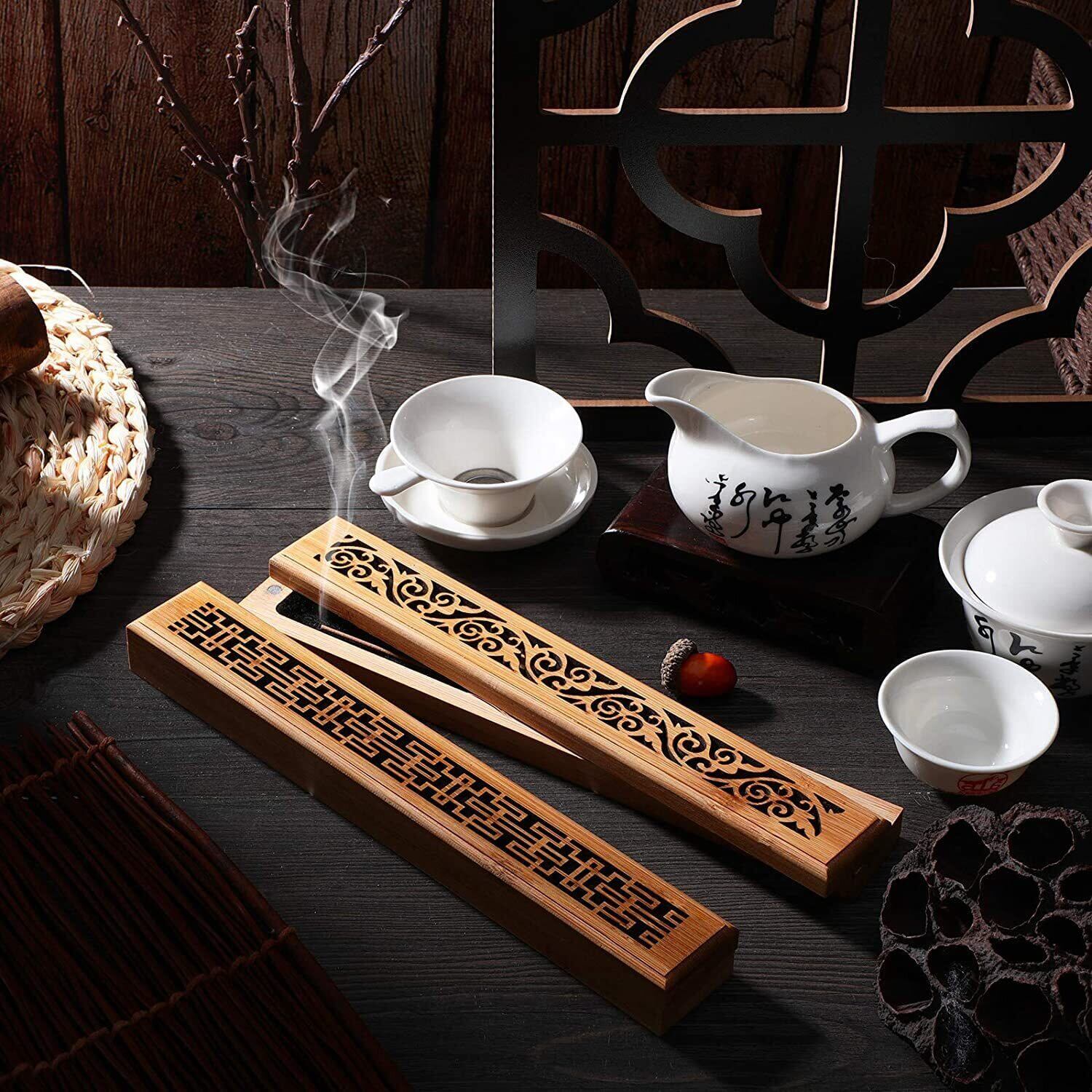 SensaBliss お香立て 横置き 香皿 木製香炉 茶道具 おしゃれ 透かし彫り 竹香炉 蓋付き線香立て 不燃綿 灰がこぼれない お香置き 携帯仏壇 瞑想 瞑坐 寝かせる 癒やし 供養 仏壇用皿 喫茶店 書斎 インテリア (唐草です)