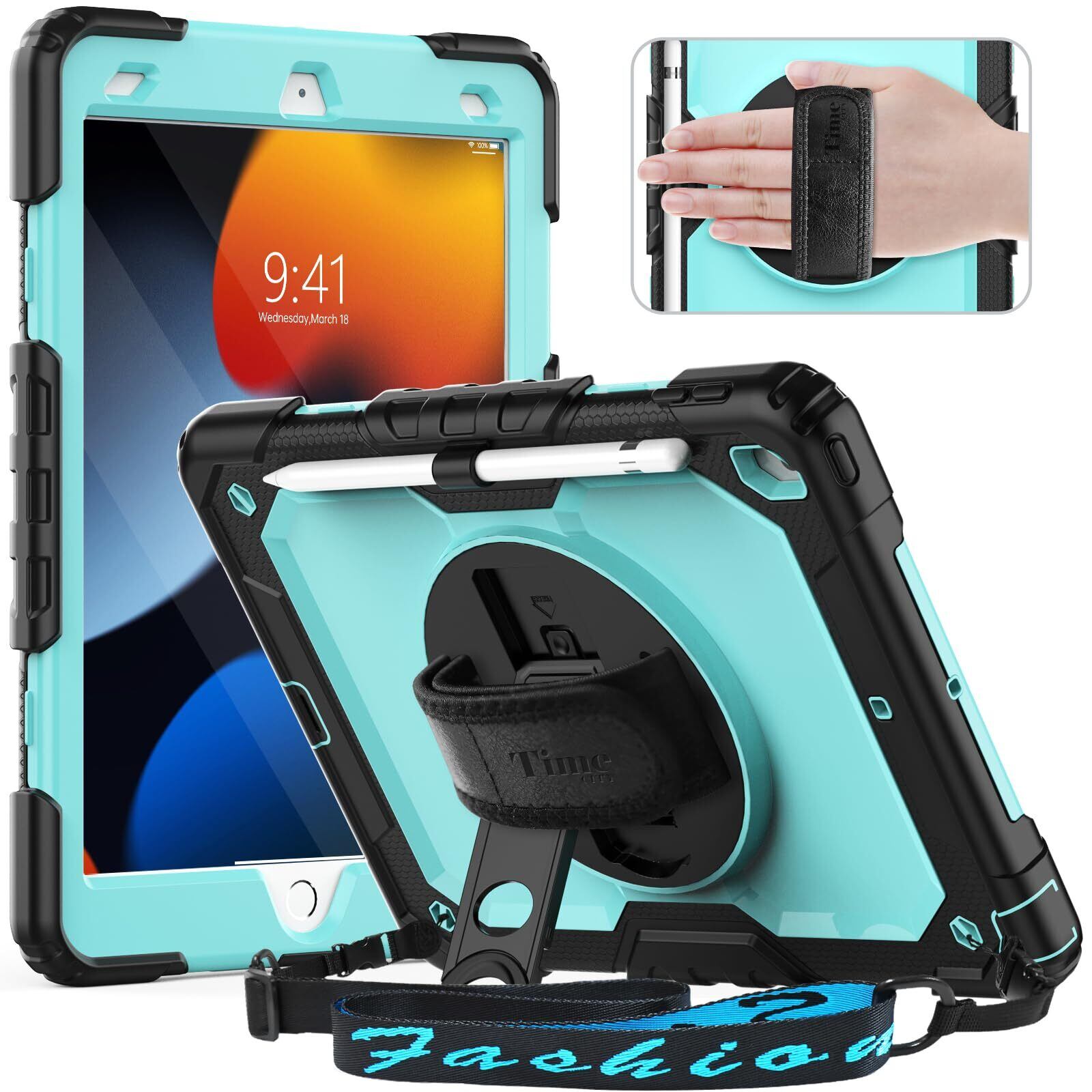 Timecity iPad 10.2 ケース (iPad 第9世代/ 第8世代/ 第7世代 ケース 2021/ 2020/ 2019型) 保護フィルム内蔵 360度回転の折り畳スタンド ハンド&ショルダーベルト ペン収納付き 頑丈 耐衝撃 現場 仕事 多機能 iPad 10.2インチ タブレットPCケース (ライトブルー)