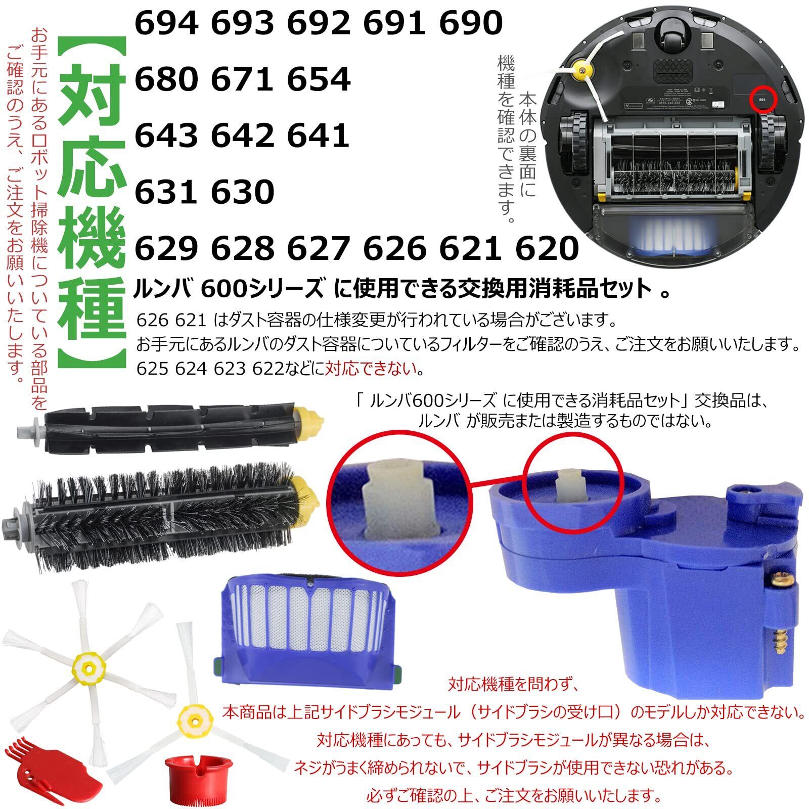 【対応機種】 694 693 692 691 690 680 671 654 643 642 641 631 630 629 628 627 626 621 620 。 ルンバ 600シリーズ に使用できる交換用消耗品セット 。「 ルンバ600シリーズ に使用できる消耗品セット」 交換品は、 ルンバ が販売または製造するものではない。625/624/623/622などに対応できない。 626 621 はダスト容器の仕様変更が行われている場合があるので、お手元にある本体のダスト容器についているフィルターをご確認のうえ、ご注文をお願いいたします。