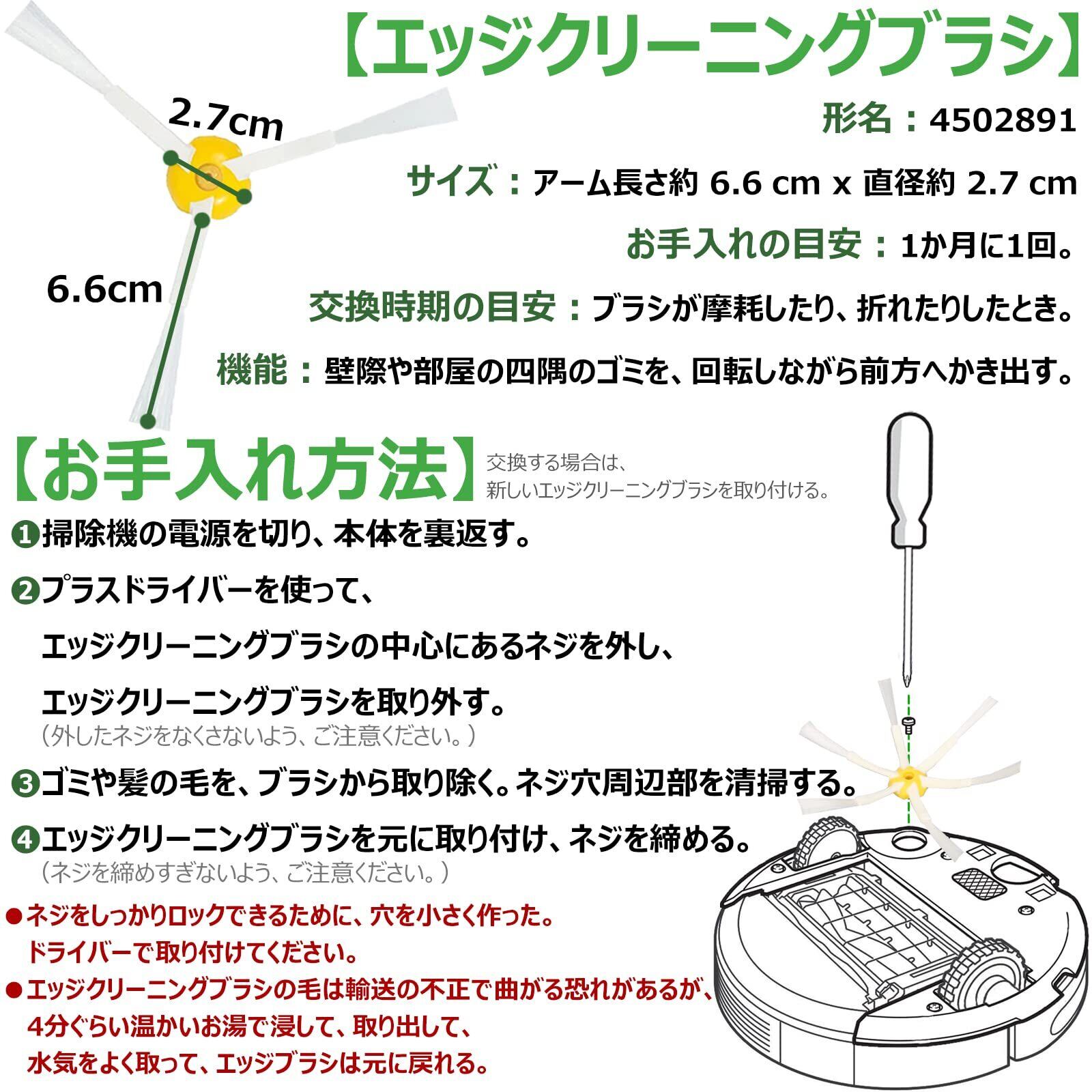 【機能】エッジクリーニングブラシは根元に通常の3倍の接着剤を使用し、先端の毛が抜けにくい、壁際や部屋の四隅のゴミを、回転しながら前方へかき出す。フレキシブルブラシとメインブラシは床面に密着し、ホコリやゴミをしっかりと取り込む。フィルターはロボット掃除機に吸い込んだホコリを濾しとり、ダスト容器内に集めて、空気のみ通して排気される。