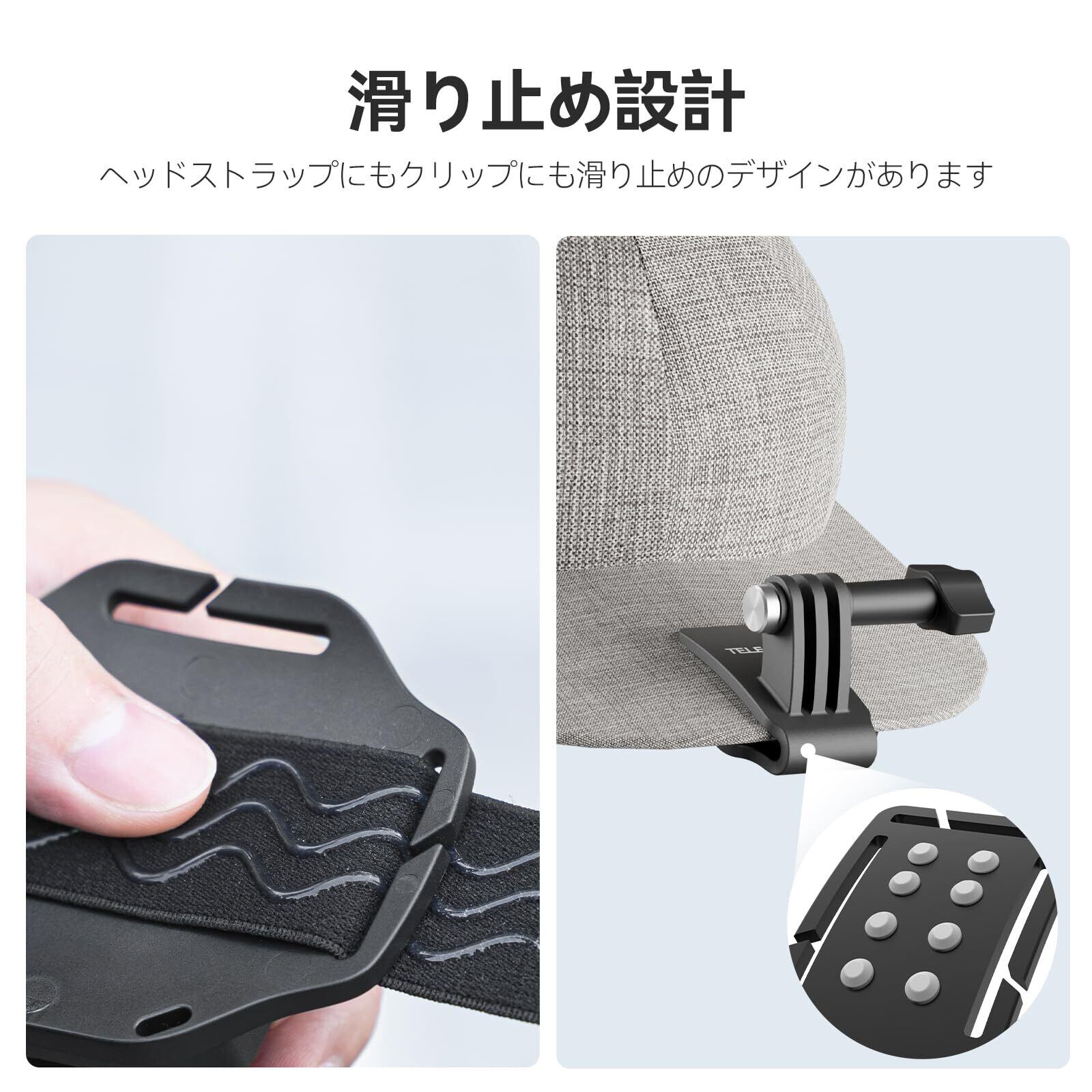 【滑り止め設計】クリップにもヘッドストラップにもシリコンゴム製の滑り止め設計が内蔵されており、揺れを防ぎ、安定性を高めることができます。
