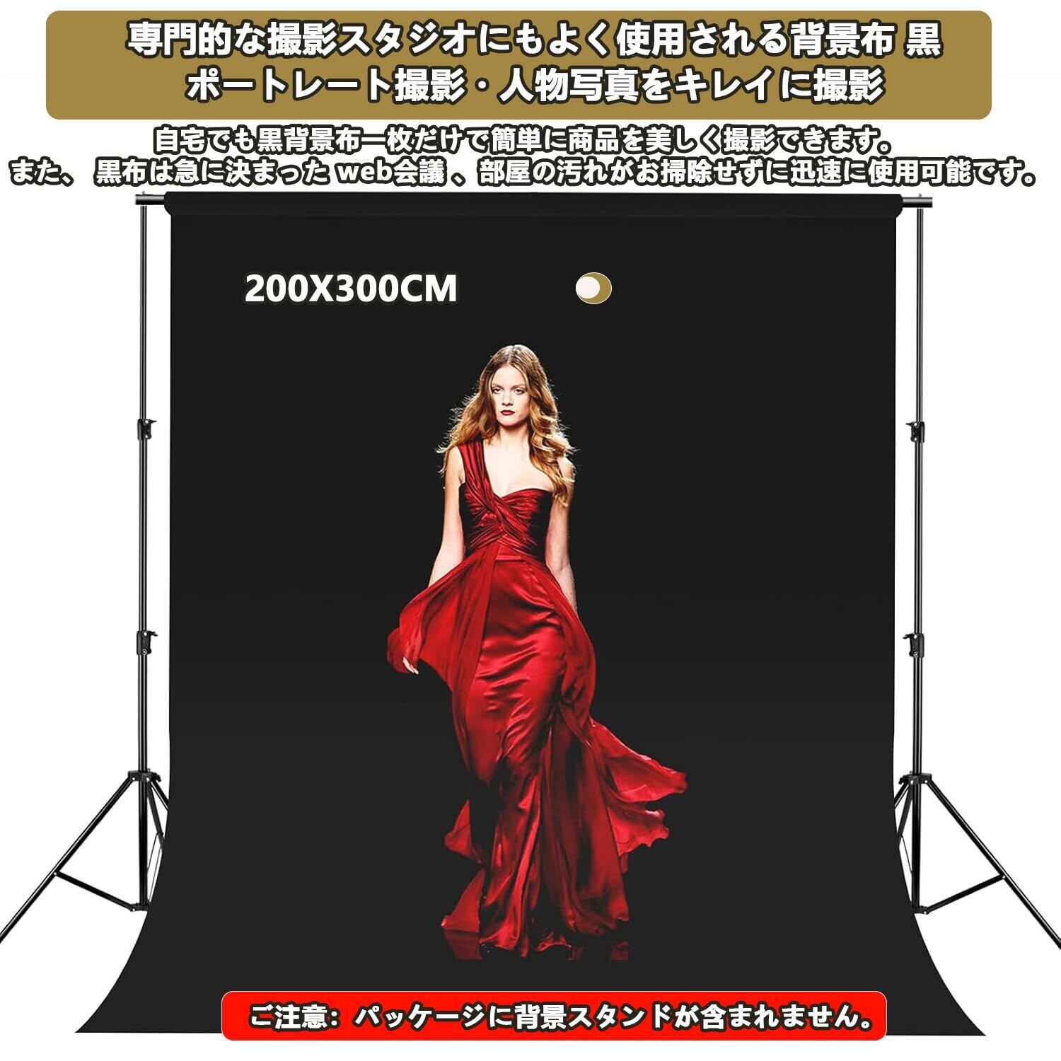 「継ぎ目の無い一枚布 & 幅広く応用可能」:1.撮影背景布 黒布は継ぎ目がなく、写真スタジオにもっとも利用されている200x300cmの背景布です。2.ホームスタジオ、クラブ、イベント、オフィス写真に理想的な製品です。3.ビデオ撮影、静物などいろいろな場面で大活躍です。